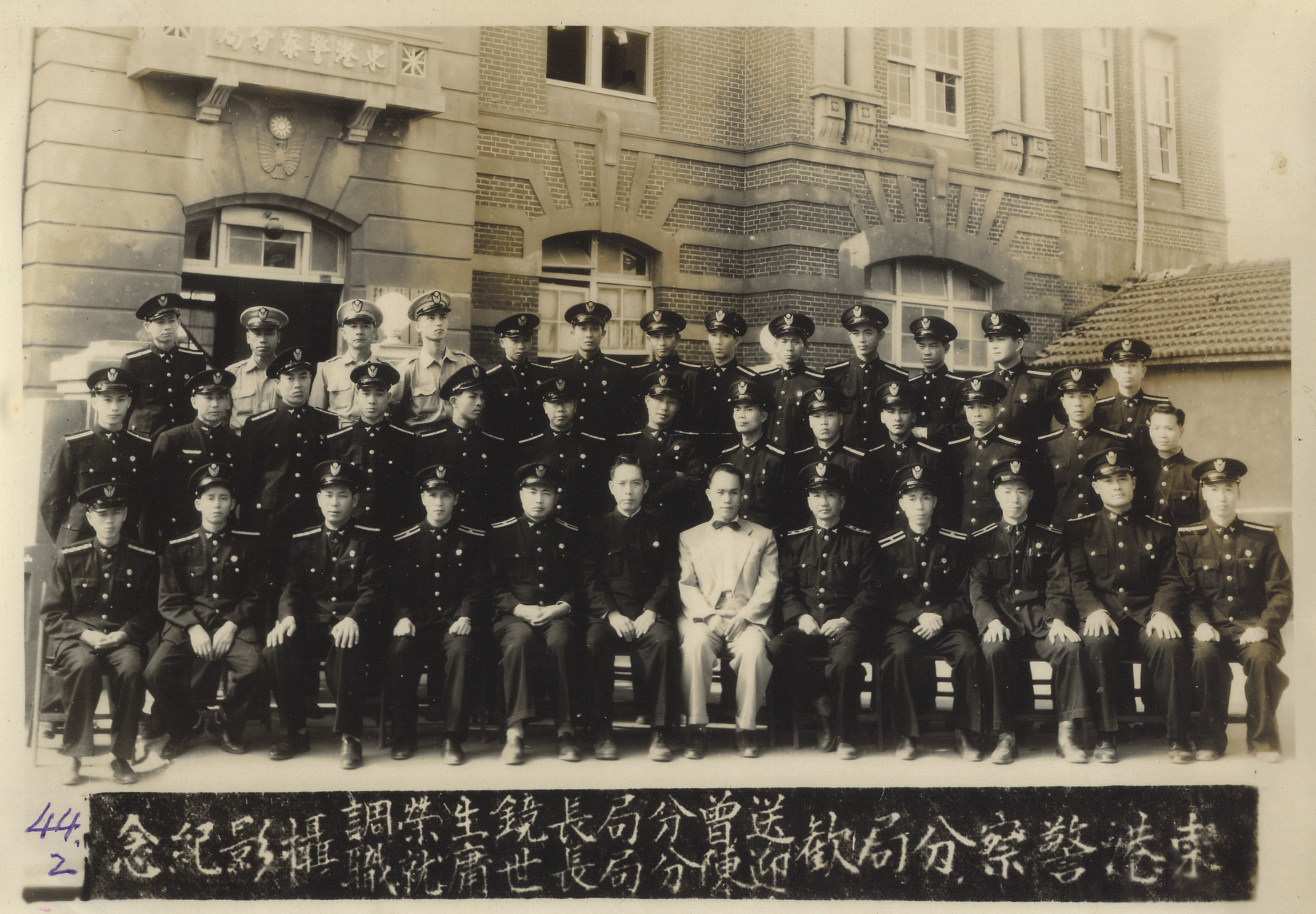 這是東港地區的警察團體照,大家穿著及姿勢都很嚴謹,專心端正地坐好或站好。照片提供者表示這是為歡送東港警察分局長曾鏡生榮調,歡迎新任分局長陳世庸就任而拍攝。