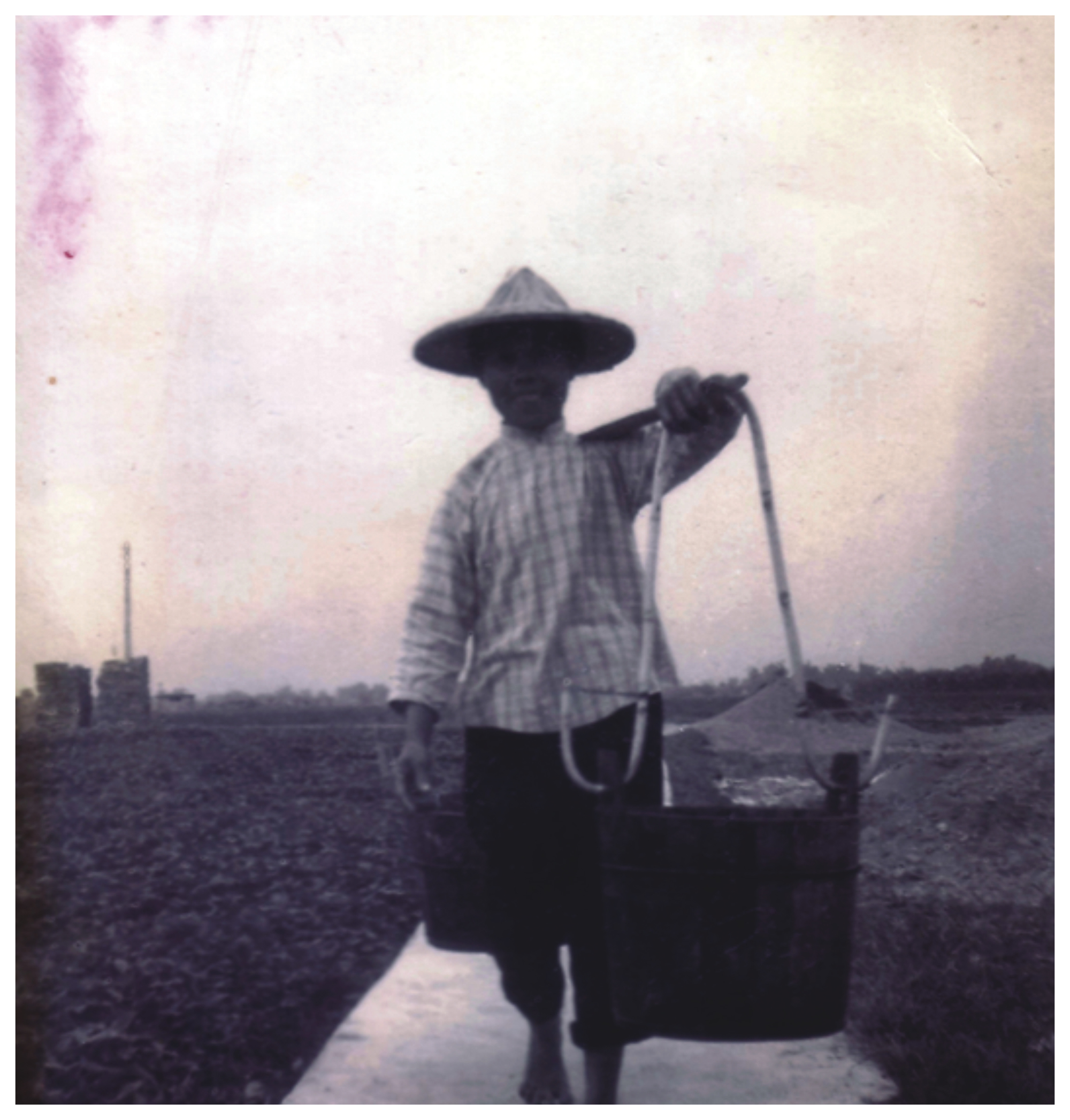 這是照片提供者曾先郎媽媽的影像,她扛著農業時代的木桶,赤腳面帶微笑朝著鏡頭走來。在農業時代,母親要照顧兒女也要務農,肩負起家庭生計的重擔。