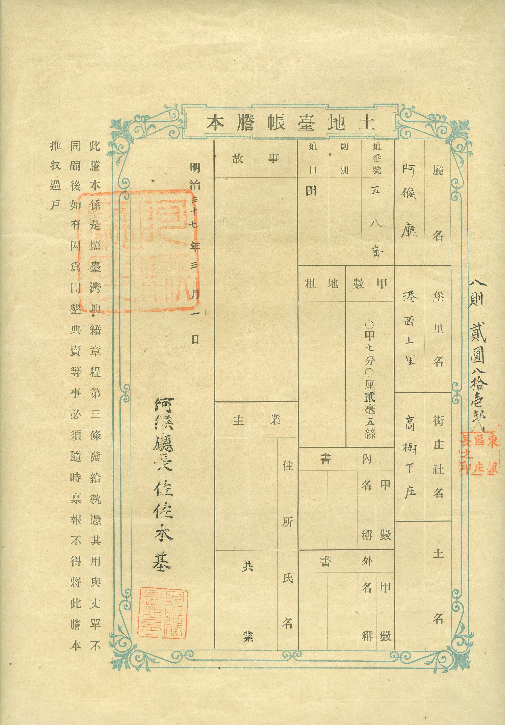 此謄本是照台灣地籍章程第三條發給執憑。土地面積有七分零厘二毫五絲,所屬高樹下庄。