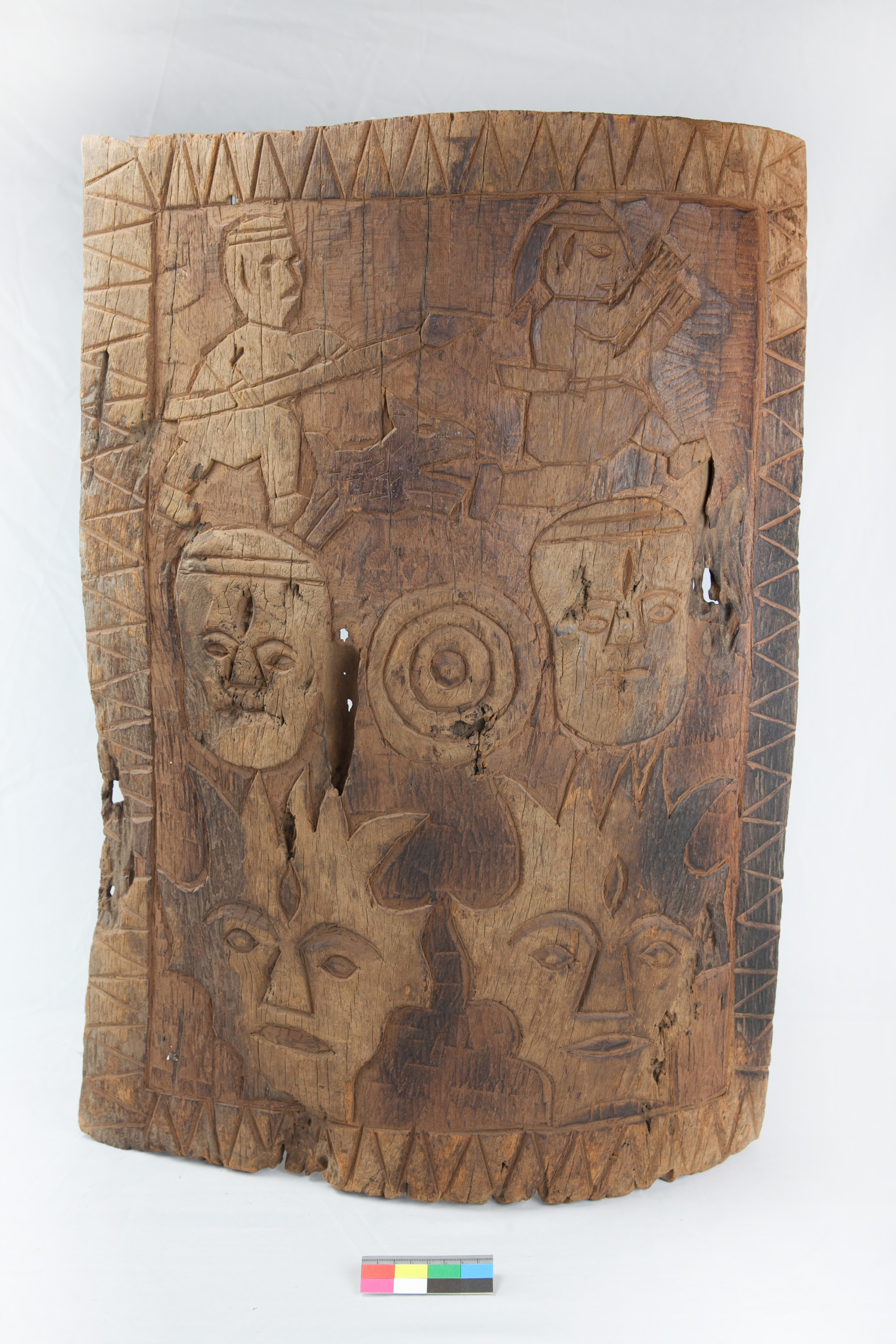 本件作品乃使用一整塊木頭挖製而成,四周邊框使用牙型紋刻飾,主體結構紋飾分成三個層次,紋飾尺寸由下而上逐漸縮小,最下層雕刻人頭紋。中間層紋飾為兩個人頭紋,中間刻飾重圓紋;最上層刻劃狩獵的情景,兩獵人手持長矛隨同一狗,追捕外族的緊張畫面。整體紋飾,為淺浮雕,刻度不深,畫面相當豐富,動靜融入同一盾面中,栩栩如生。