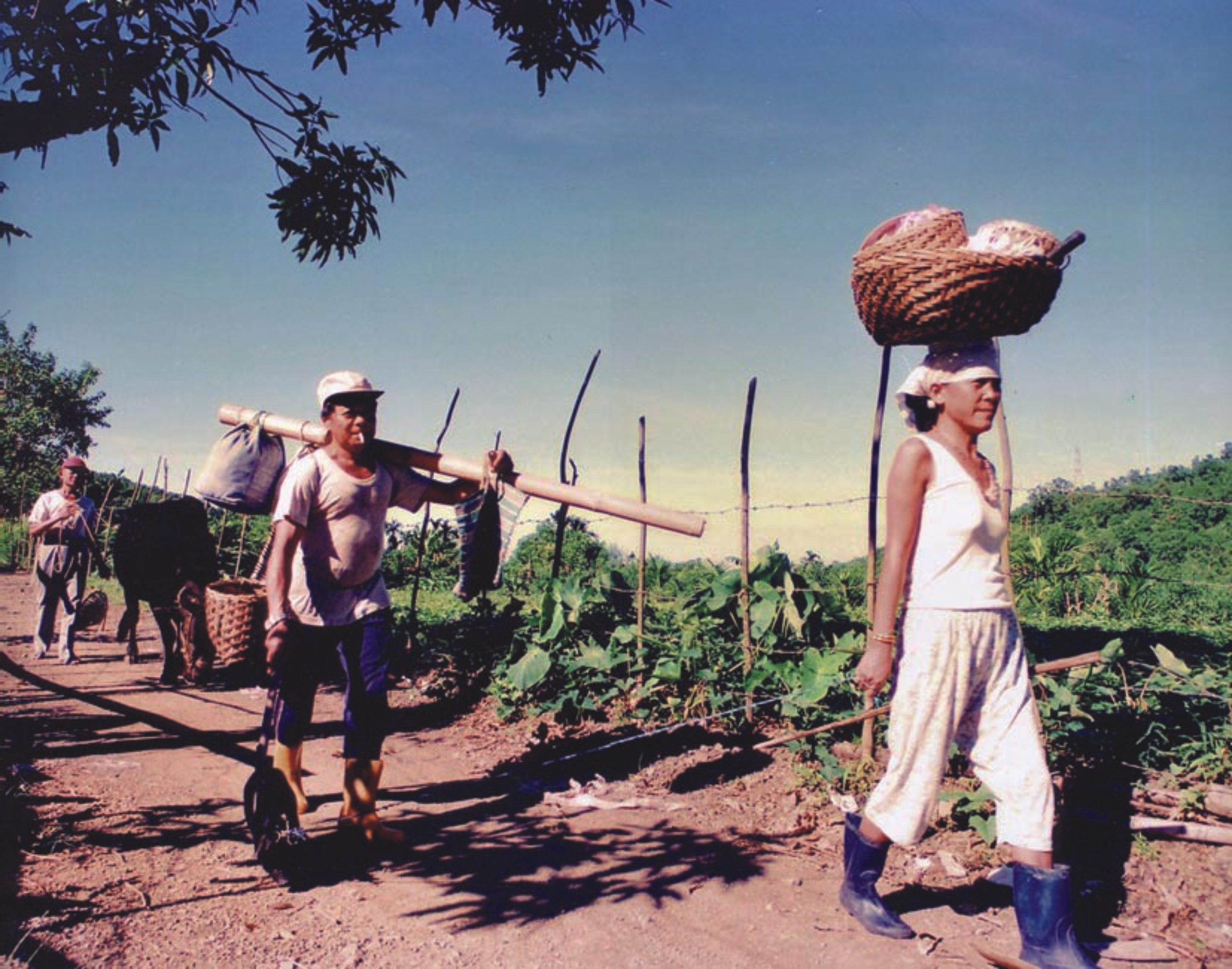一名原住民婦女頭頂一大盒編織用品,後方男子挑著一根竹棍,右手牽著一隻小黑狗,照片中最後方的老先生則牽著一頭老牛緩緩前進,三人的步調舒緩而自在。