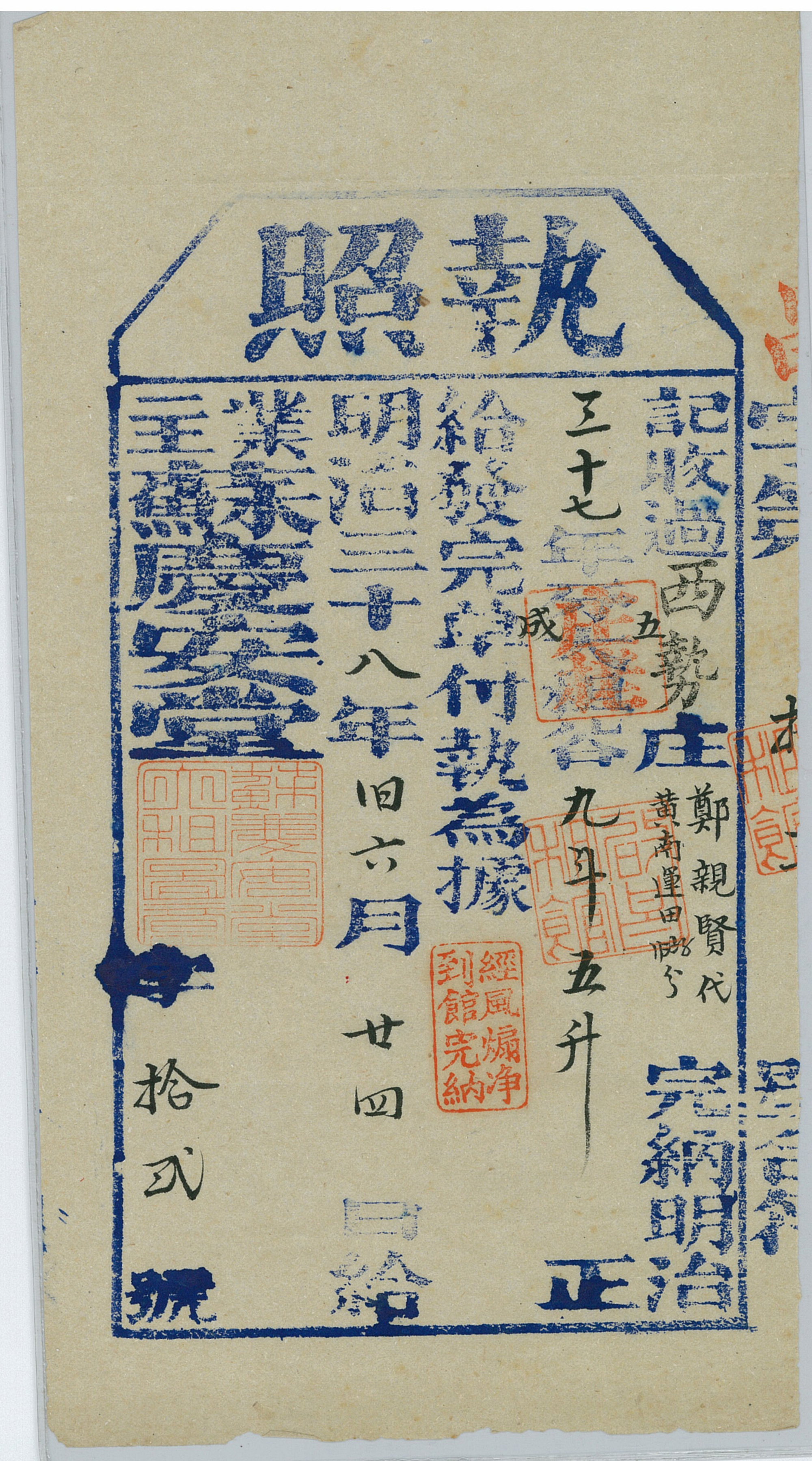 明治38年業主蘇慶安堂記收過西勢庄鄭親賢代黃南運完納明治37年分大租9斗5升正,給發完單付執為據。