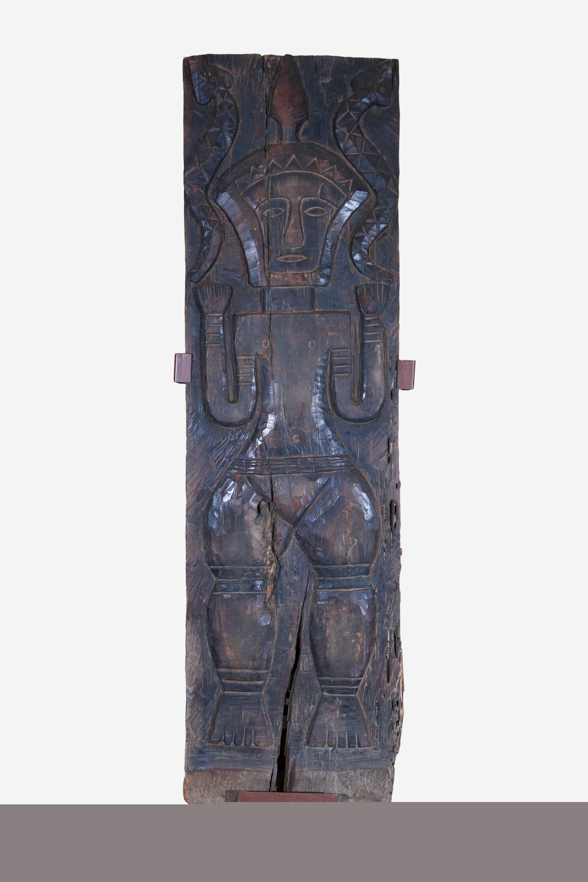登錄理由:本件壁板,使用臺灣貴重、材質優良的「臺灣櫸」木材為雕刻素材,以陽雕的方式雕刻一人像,頭大、身體小、腿部粗,比例特殊,頭部上方刻一矛頭、額頭刻一山形紋,兩側刻S造型的百步蛇紋飾;雙手舉起至頸部,大腿和小腿間以三橫紋表現腿部的壯碩。