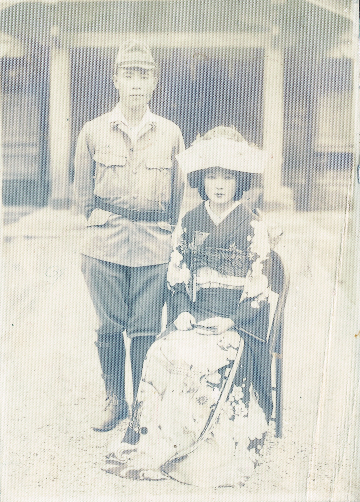 照片提供者張敏子母親的朋友-萬巒鄉五溝人劉鳳祥與日本籍小姐在日本昭和時期結婚,當時他穿著日本軍服與穿著日本和服的太太合影。