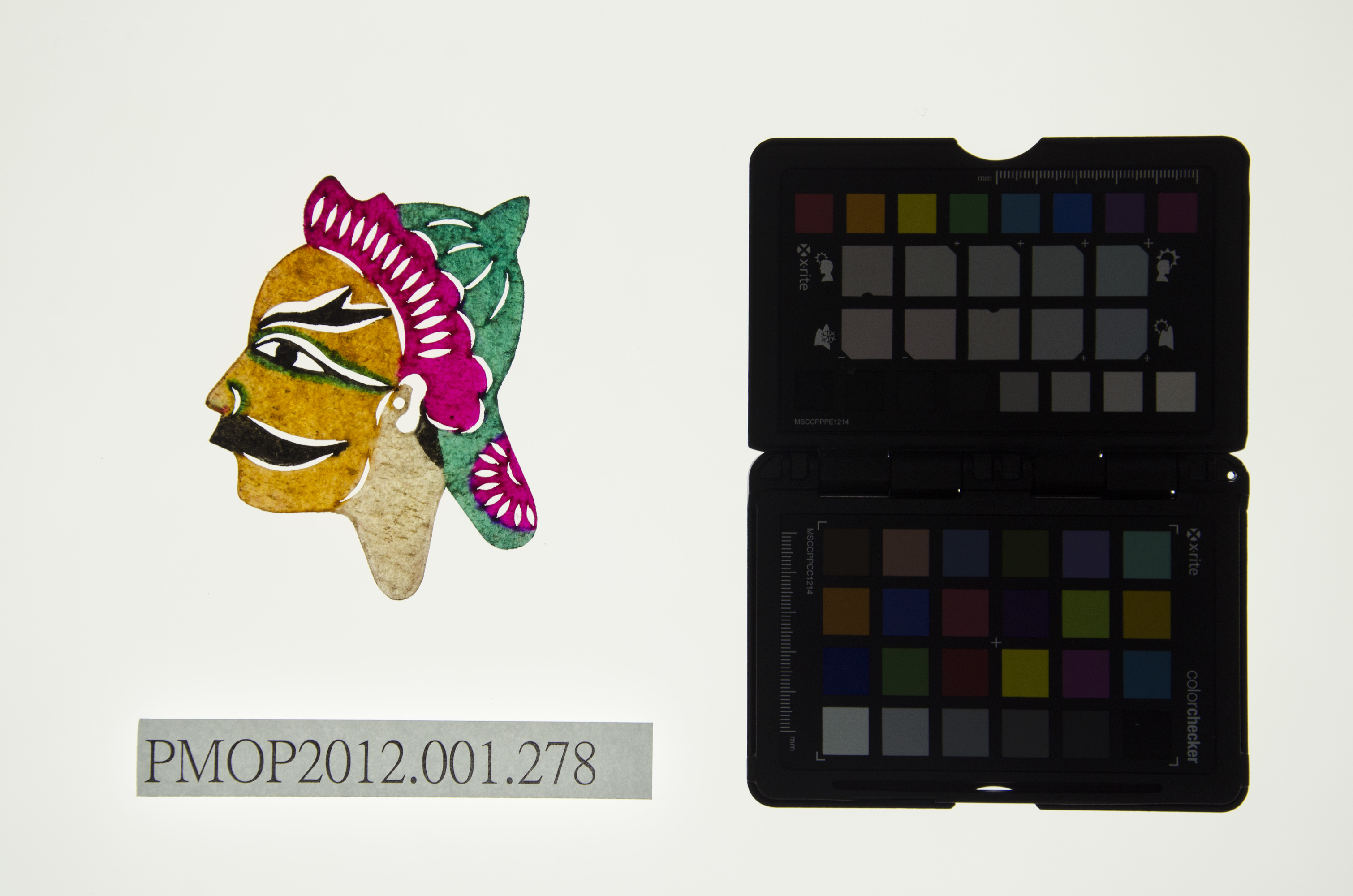 角色說明: 花臉武將。 技法說明: 頭戴額子盔頭武將,側面五分相陰刻花臉。 詮釋者-東華皮影劇團 張榑國 藝師