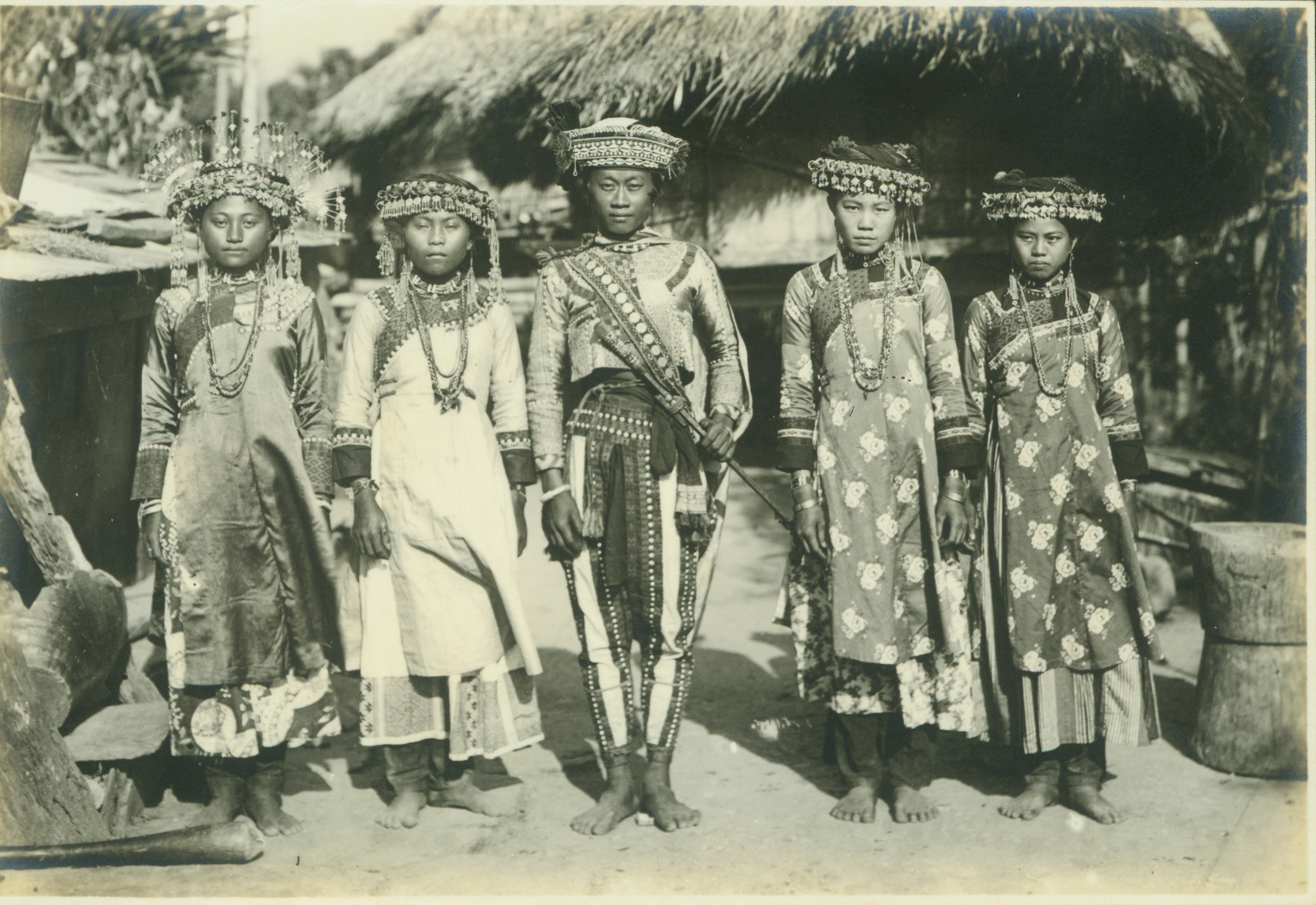 日治時期三地門社盛裝的青年男女,正中男子為頭目兒子。