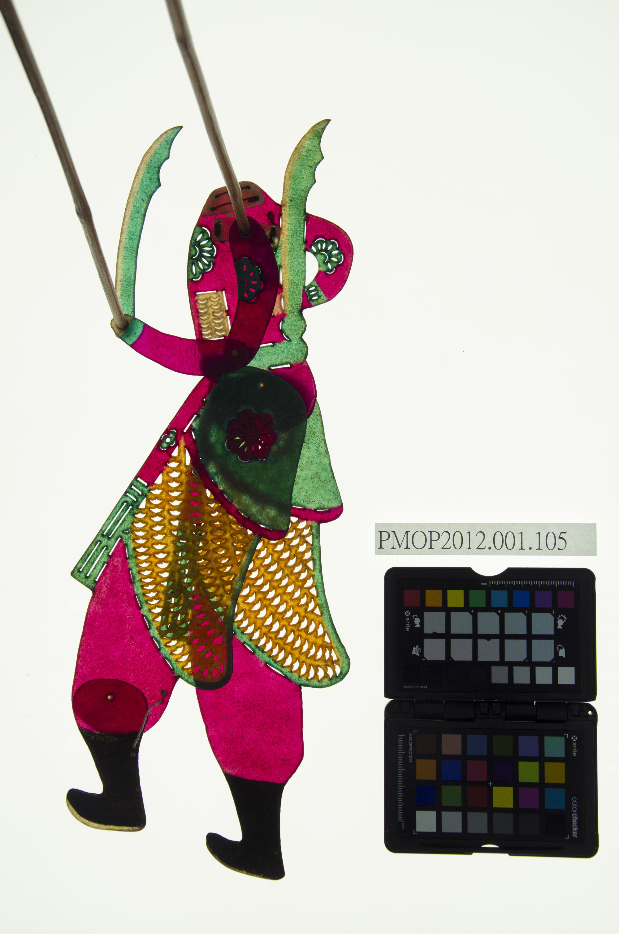 技法說明: 武打傳統造型,腹部與下半身著刻有魚鱗紋冑甲。雙桿操作,僅單手活動,另一隻手插腰,固定位相無法轉身。