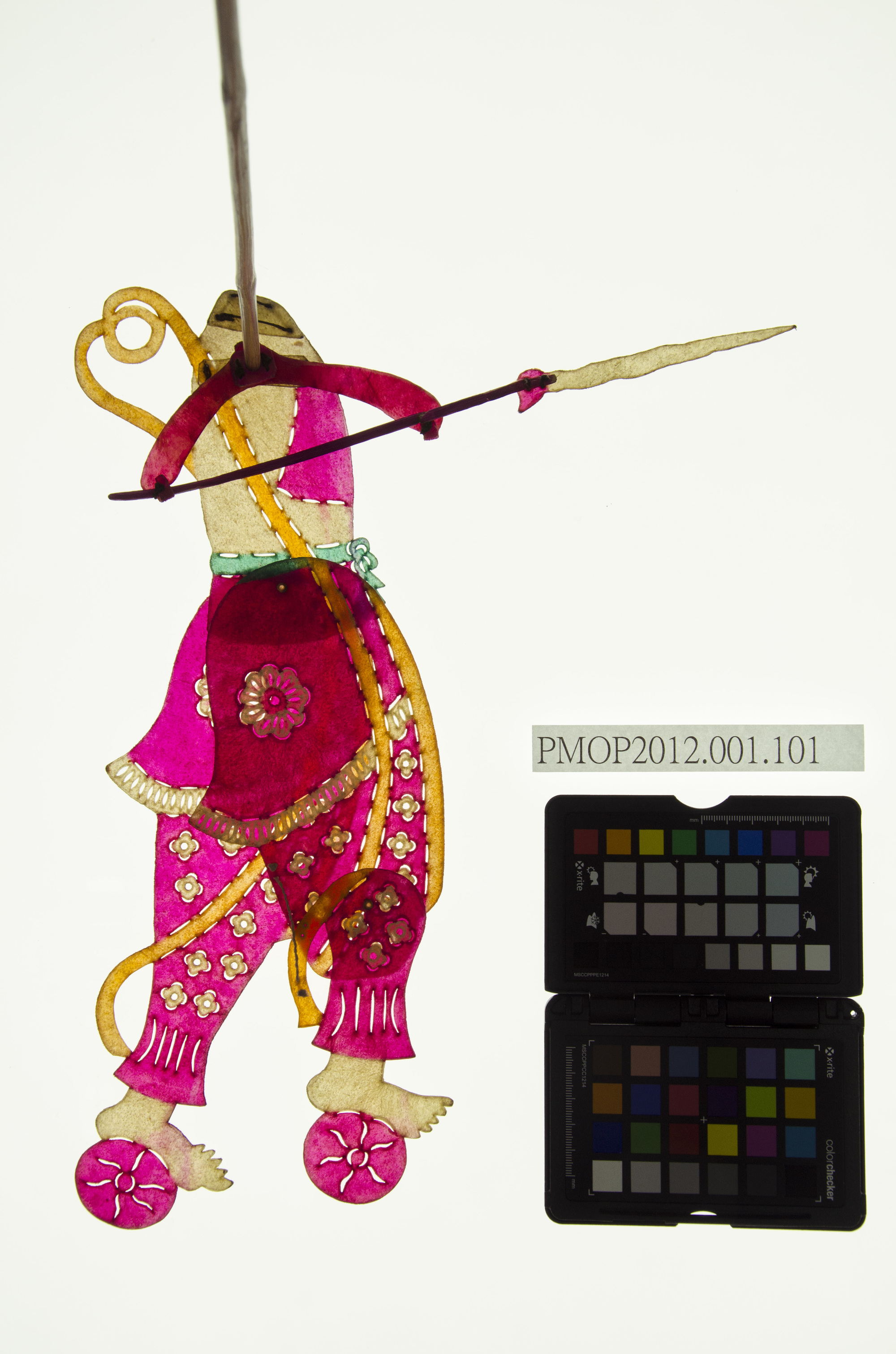 角色說明: 哪吒。封神榜中李靖之三子。 技法說明: 胸前著肚兜,肩披混天綾,腳踩風火輪。僅單桿操作。