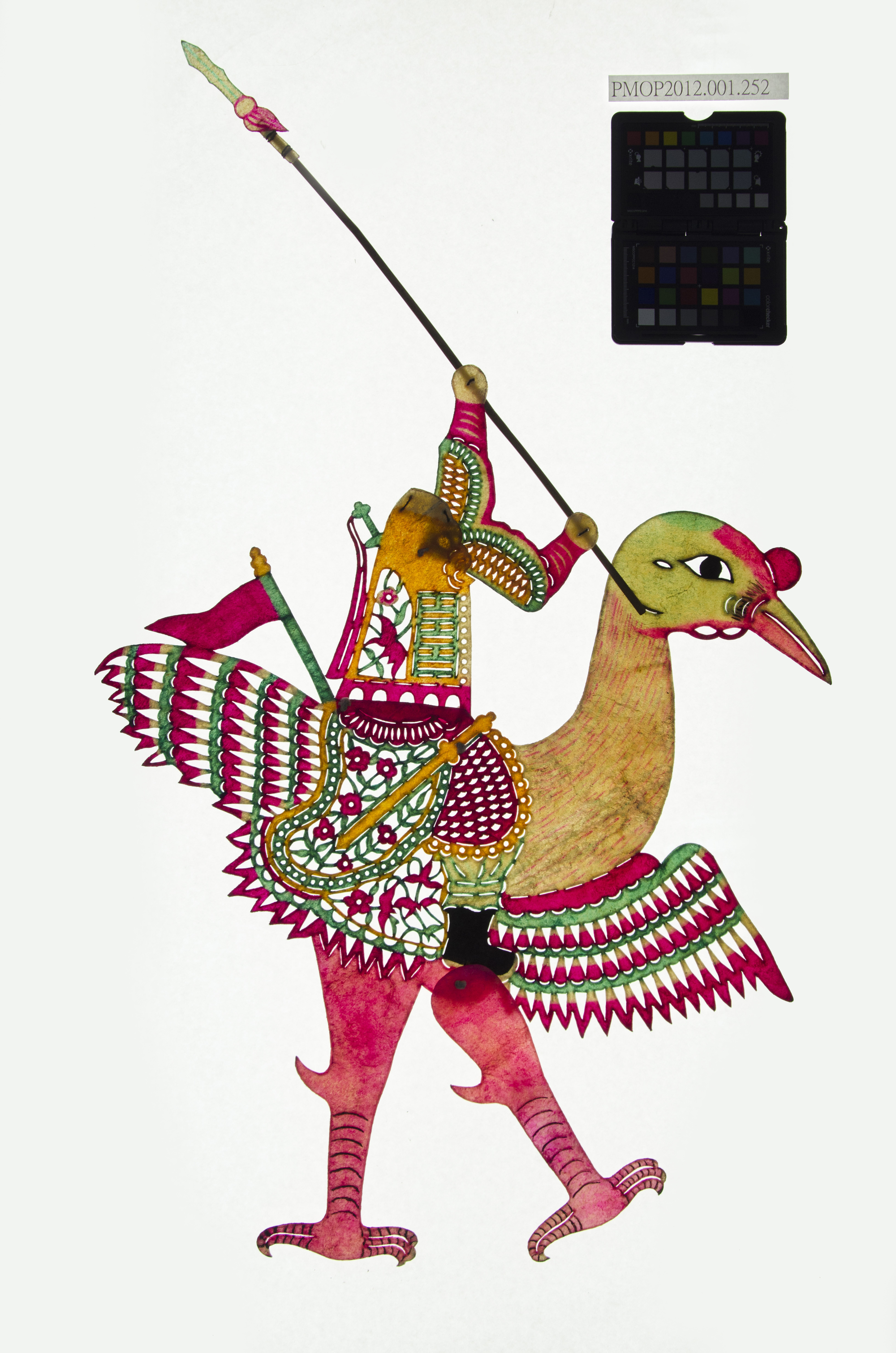 角色說明: 騎大鵬鳥武將 技法說明: 身穿連枝花紋與魚鱗紋冑甲,手持長矛。大鵬鳥展翅。