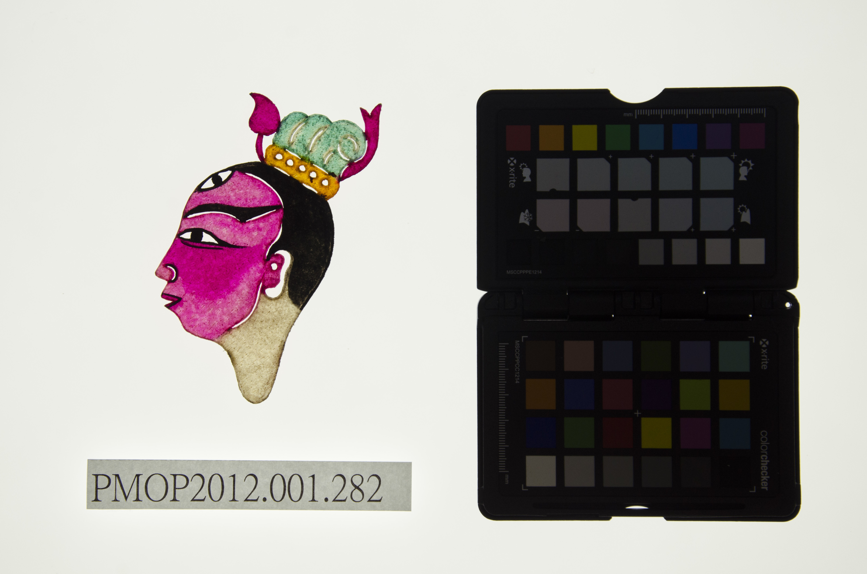 角色說明: 封神榜,二郎神楊戩,武生。 技法說明: 側面五分相陰刻紅面,有天眼,頭戴三山飛鳳帽。 詮釋者-東華皮影劇團 張榑國 藝師
