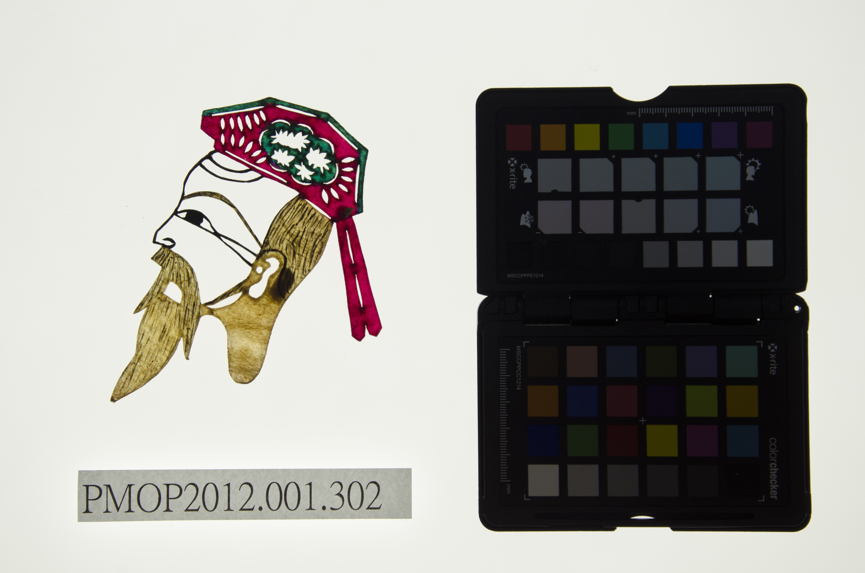 角色說明: 末。 技法說明: 側面五分相陽刻,滿臉皺紋,鬢白鬍鬚,適合老員外造型。 詮釋者-東華皮影劇團 張榑國 藝師