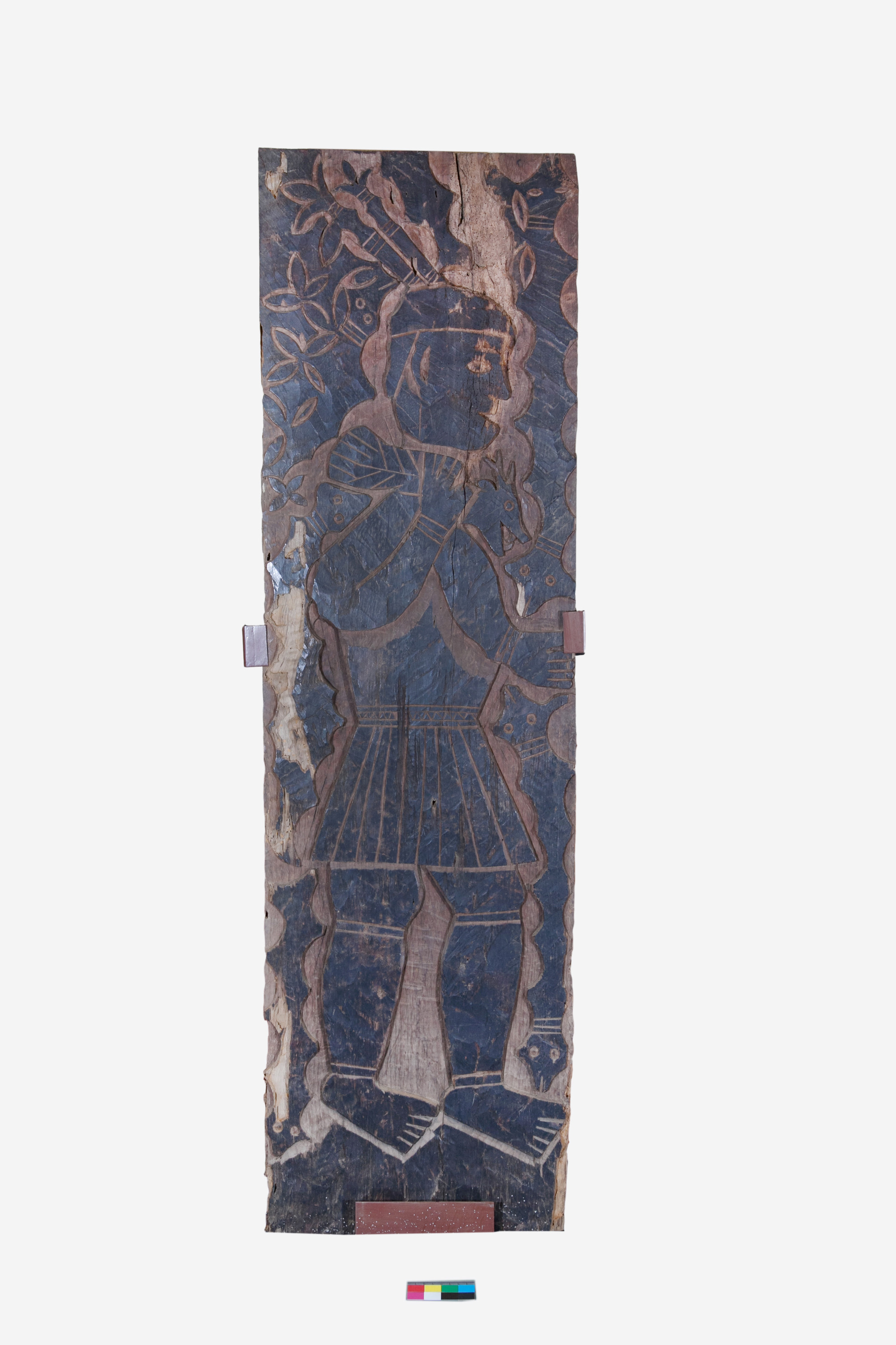 登錄理由:本件雕板以人物為主題,採側身、肩背獵物為雕刻重點,身著傳統服飾,頭戴羽毛、著短裙、赤足、腳踏土地。木雕臉部表情活潑、眼睛炯炯有神,似乎傳達著獵物豐收之意。人像周圍輔以百步蛇紋飾,蛇的部頭表情與主體人像雕刻互動性佳。