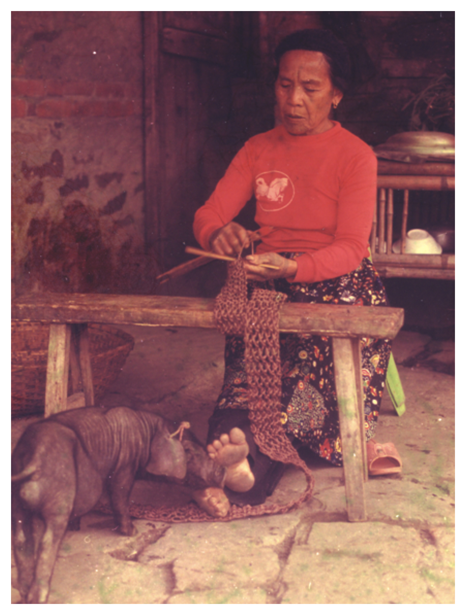 在我們的生活中,養寵物是常見的事,但在這張相片中,出現了最特別的寵物-牠是一隻愛舔人腳指頭的小山豬,而牠的主人正在進行編織。