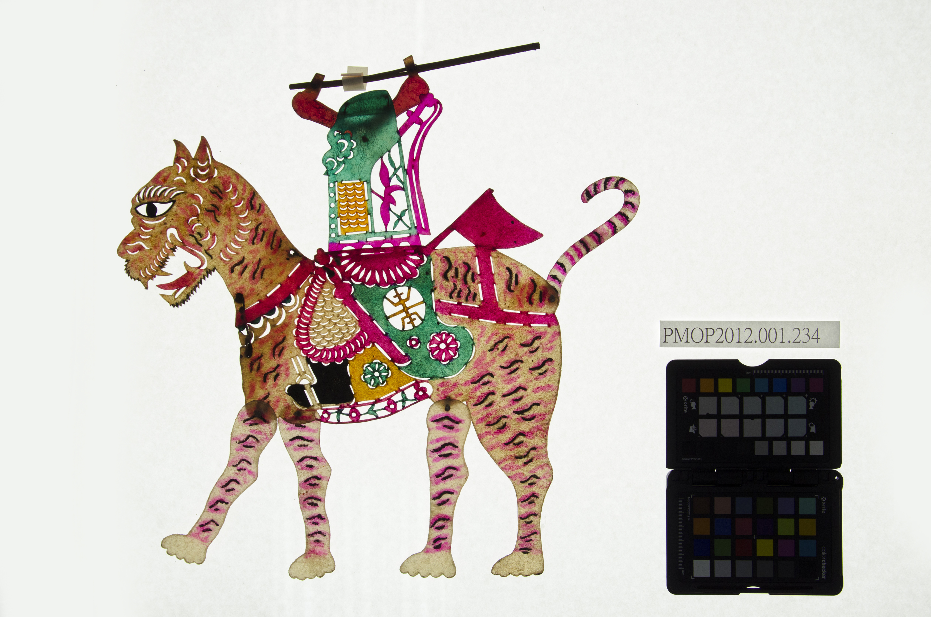 角色說明: 騎虎武將。 技法說明: 身穿連枝花紋與魚鱗紋戰甲,雙手持長戈,背劍。單桿操作。