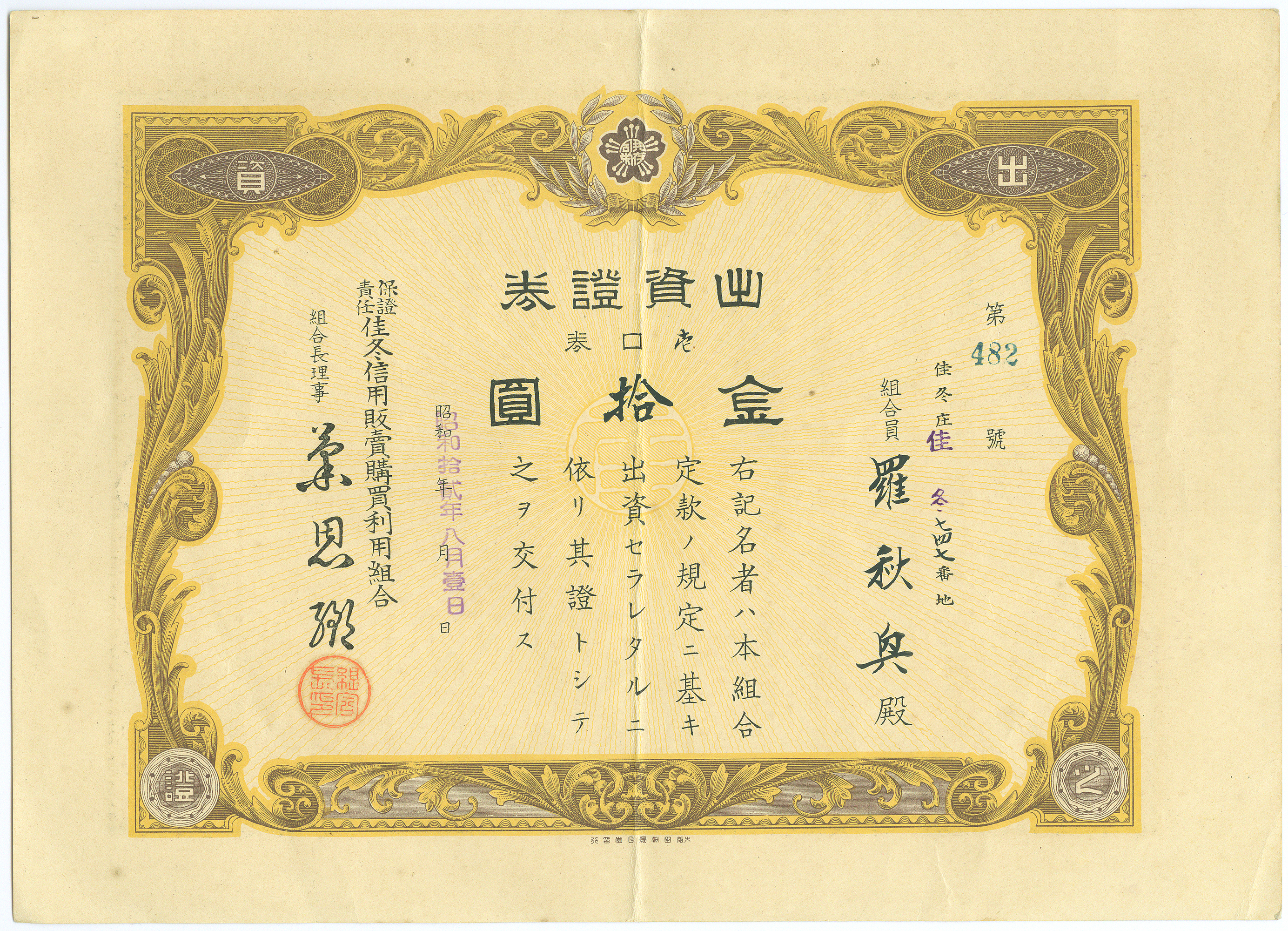 佳冬信用組合之出資證券,組合員羅秋興殿金拾圓。