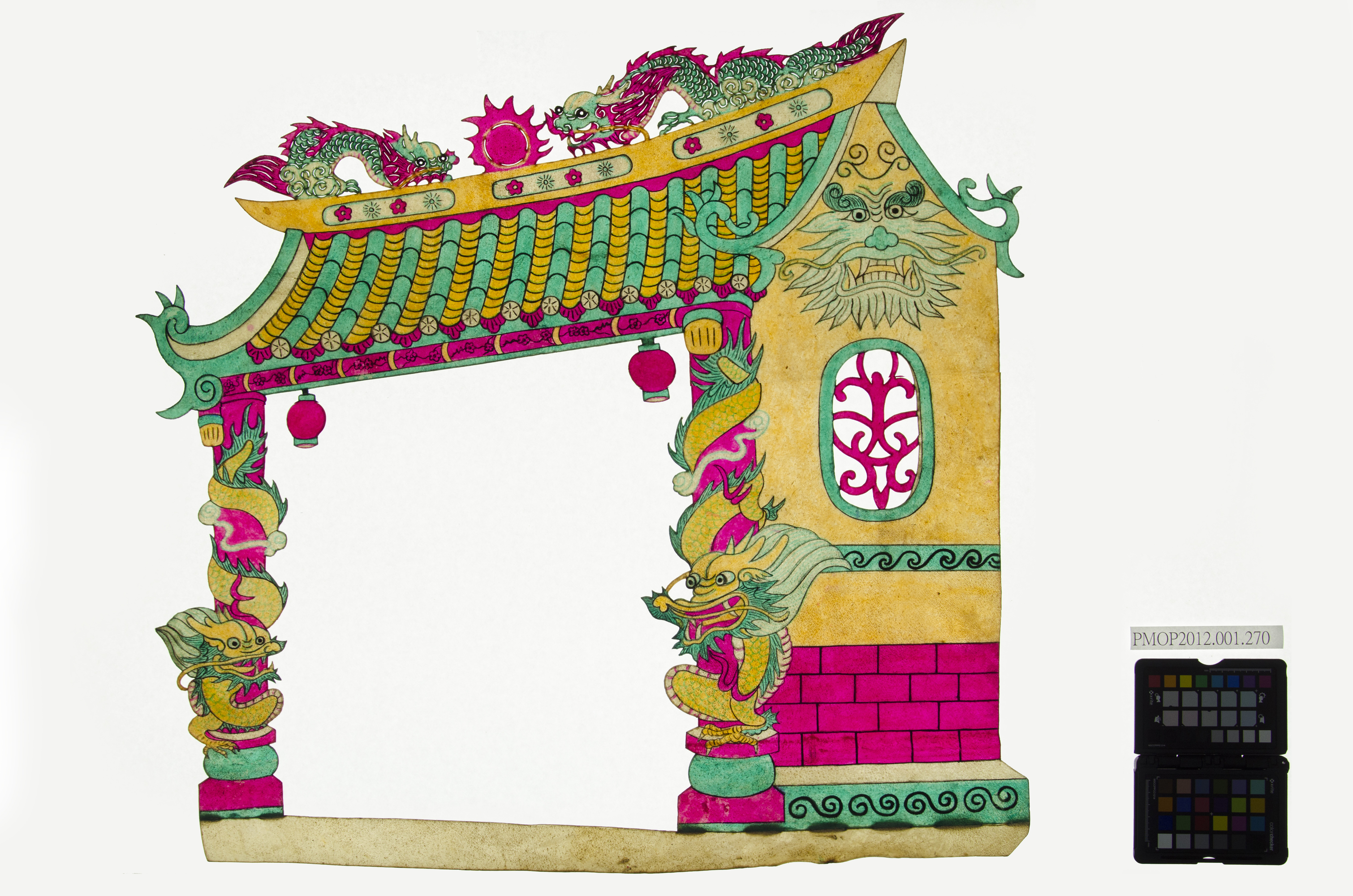 角色說明: 富麗堂皇府第。 技法說明: 門口兩側各有盤龍懸繞樑柱,屋頂刻有雙龍戲珠,連枝窗花窗戶。
