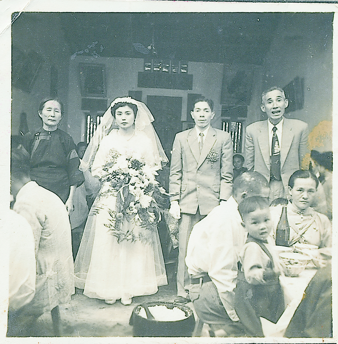照片提供者張敏子的父母張鏡明及鍾菊英在張氏祠堂前的宴客照,彷彿可以感受到喜宴的熱鬧喧騰,新郎右方為大明國小校長林開德,特別前來證婚及祝福。