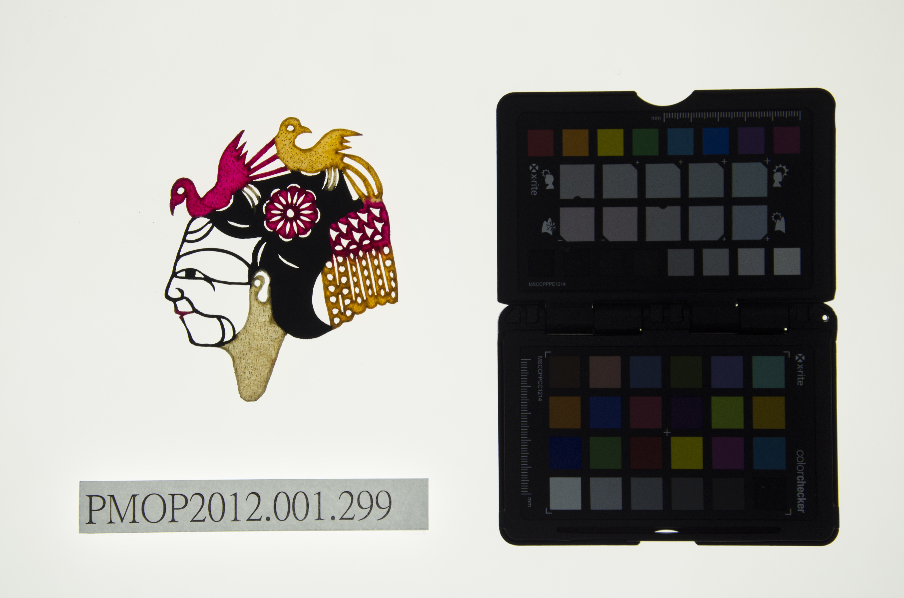 角色說明: 老旦 技法說明: 側面五分相陽刻,滿臉皺紋,頭戴鳳冠,為皇太后角色。 詮釋者-東華皮影劇團 張榑國 藝師