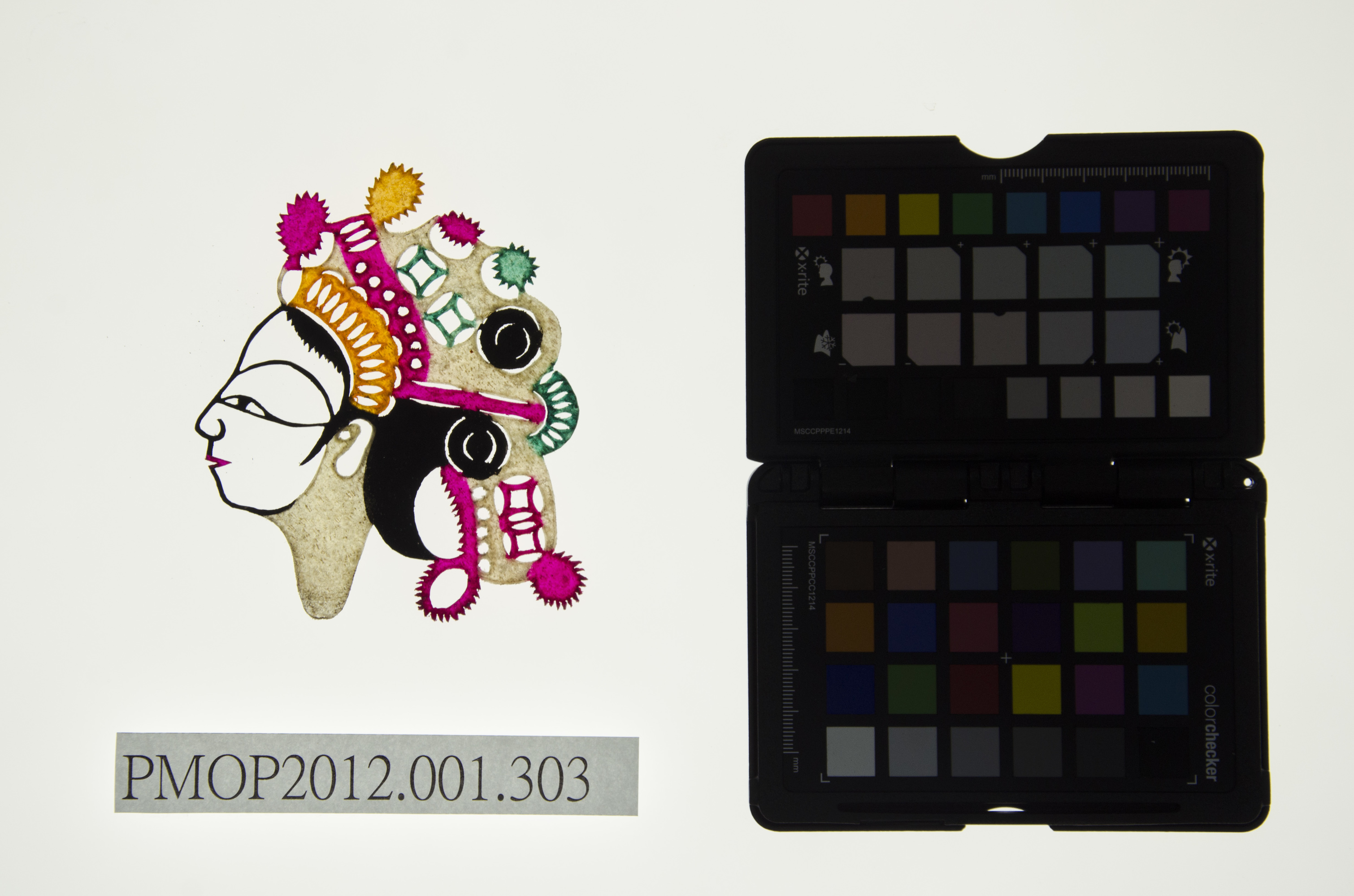 角色說明: 女將 技法說明: 側面五分相陽刻,頭戴大額子盔,飾有絨毛亮片,髮後有流蘇下垂。 詮釋者-東華皮影劇團 張榑國 藝師