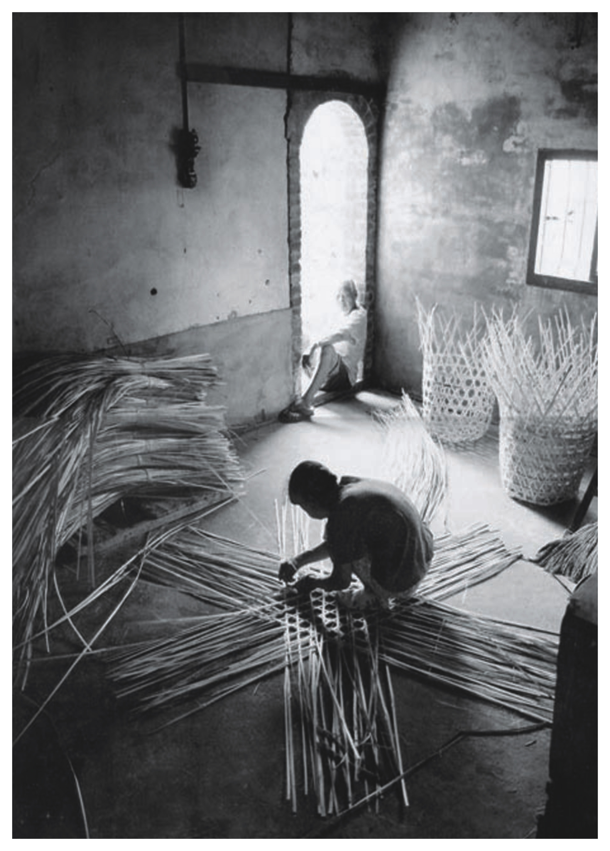 在屏東縣傳統的農業社會中,農民以竹子為材,編織出許多手工日常生活用具,此張相片裡,是一名工匠在幽暗的房內,低著頭編織竹籃,我們可以知道這就是他的生活、他的一切。如今,雖然這樣的景象已不常見,但確可透過影像的呈現再次回味。