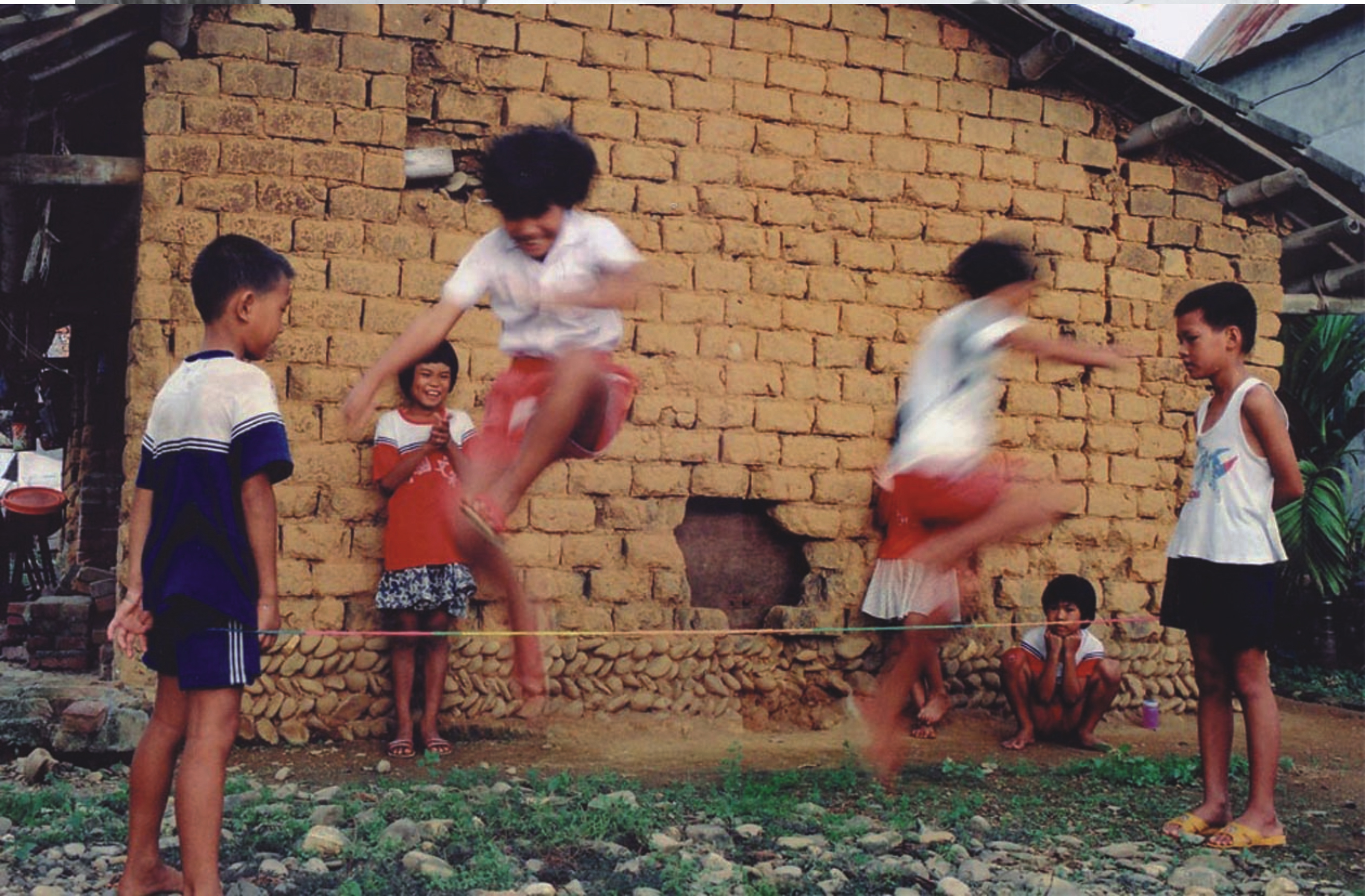 小朋友在老厝邊玩跳繩,背景是一棟土塊興建的老房子。