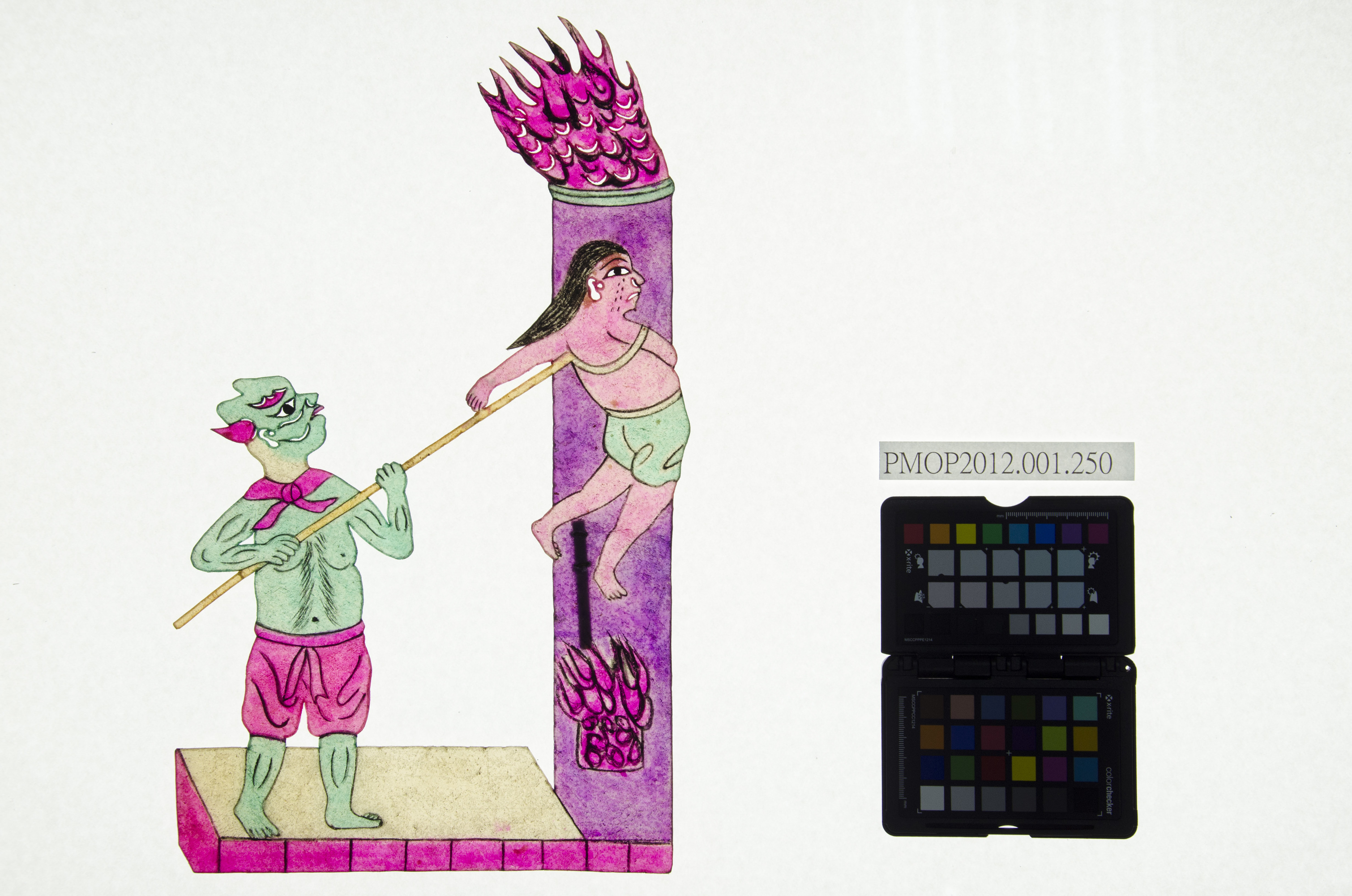 角色說明: 陰曹地府行刑場面,抱火柱。 技法說明: 整件一體成形刻製,單桿固定,無法操作活動。