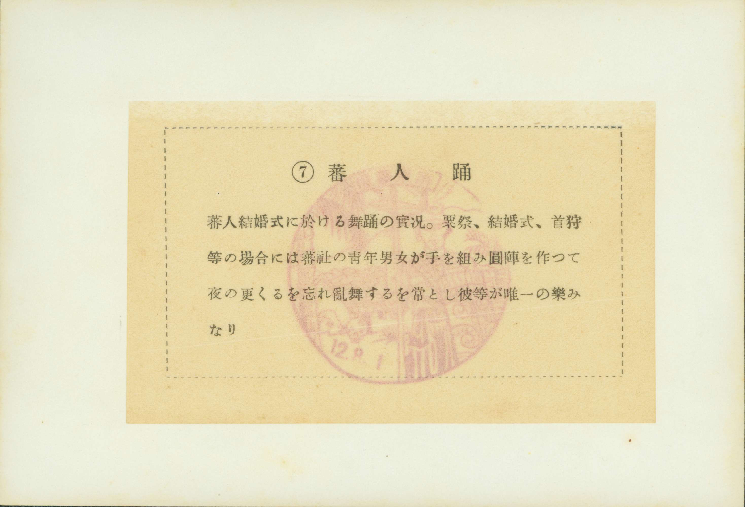 日治時期原住民的傳統圓舞,常見於祭典、婚禮或獵首之後。
