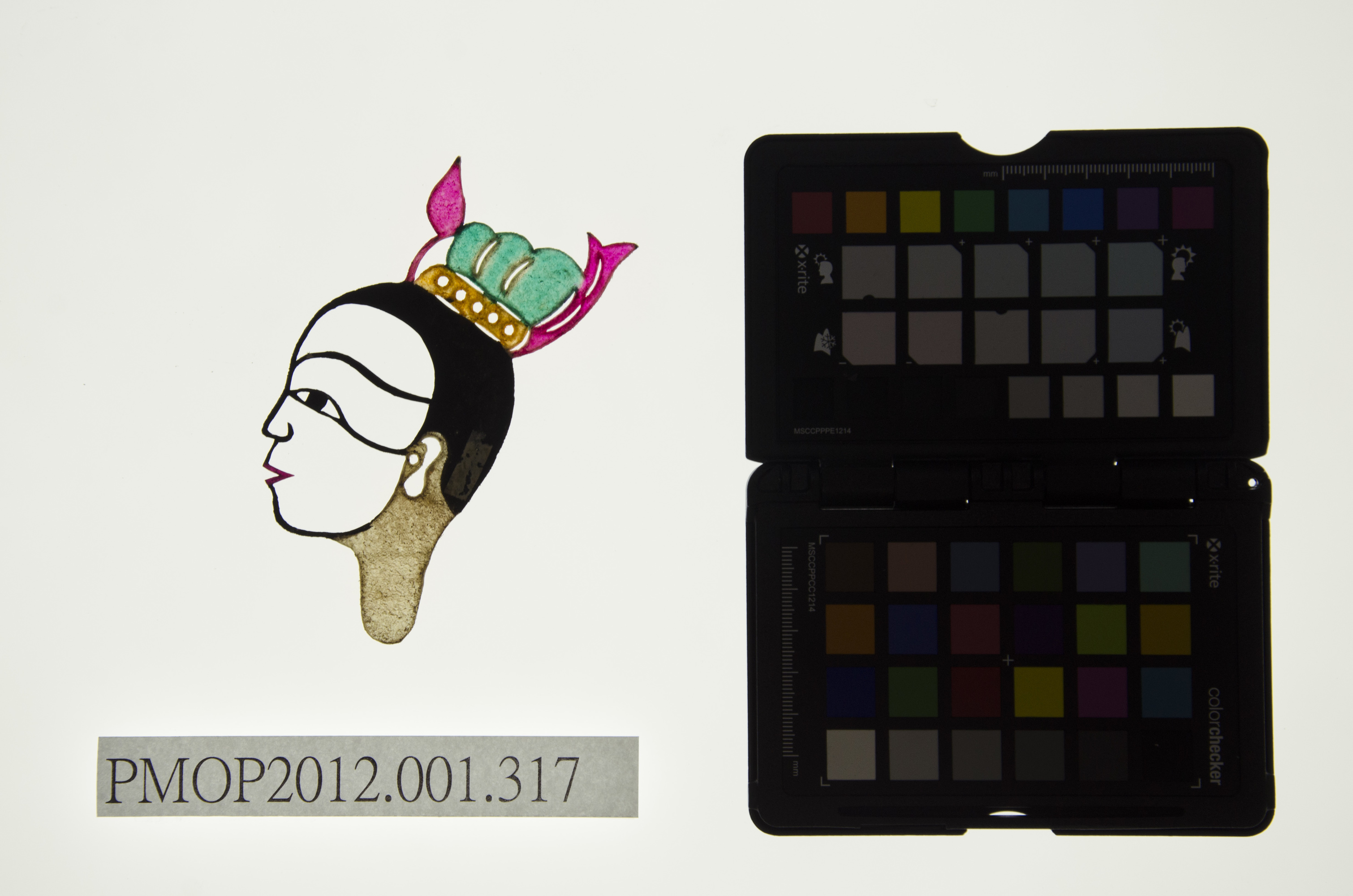 角色說明: 哪吒 技法說明: 側面五分相陽刻,頭戴太子盔。 詮釋者-東華皮影劇團 張榑國 藝師