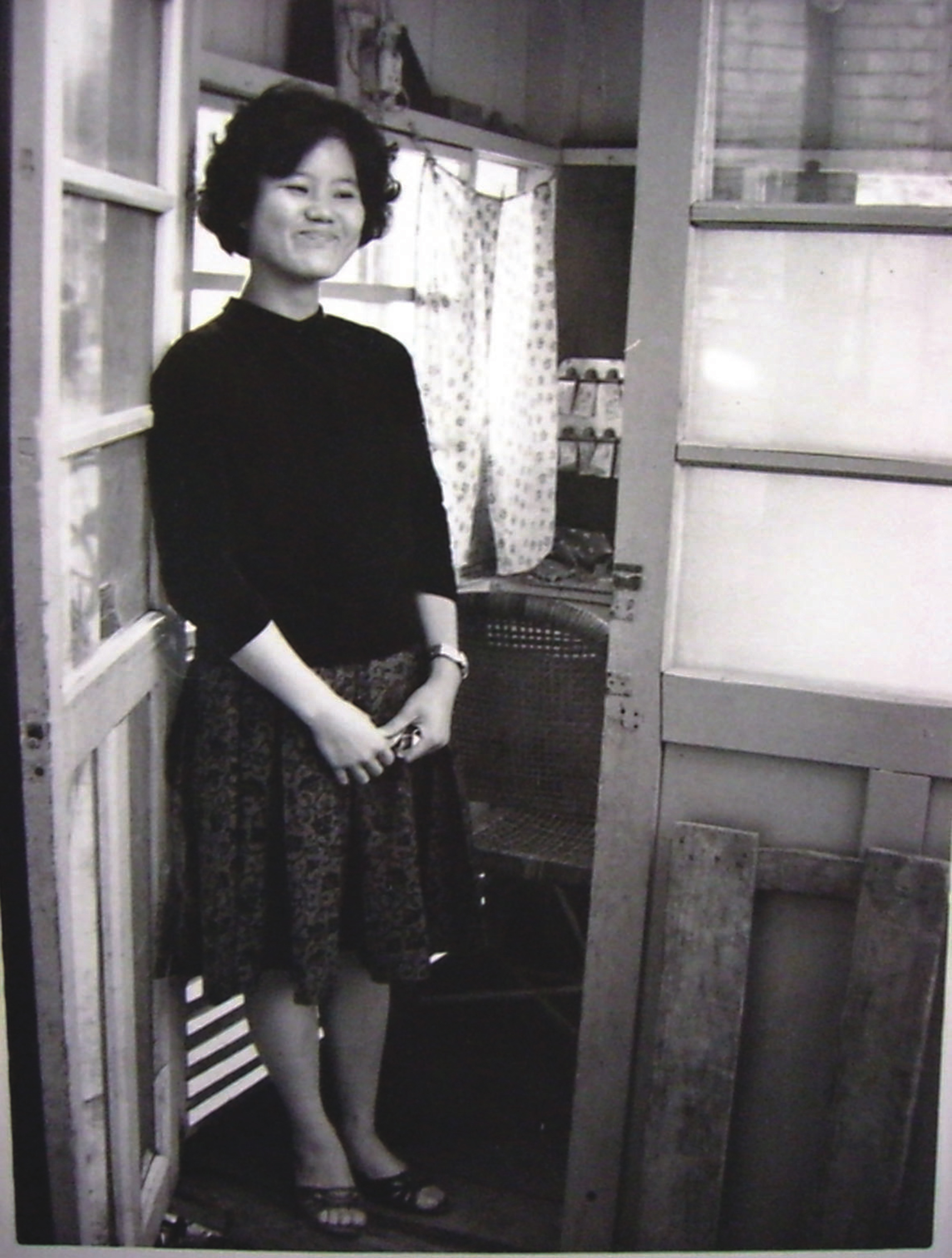 照片提供者范芳玲的母親曾玉女倚靠在票亭門前,似乎有話要說,但用淺淺的笑靨代替。照片中可隱約看到夾著票的票卷,而門板是以日式的層板釘成。