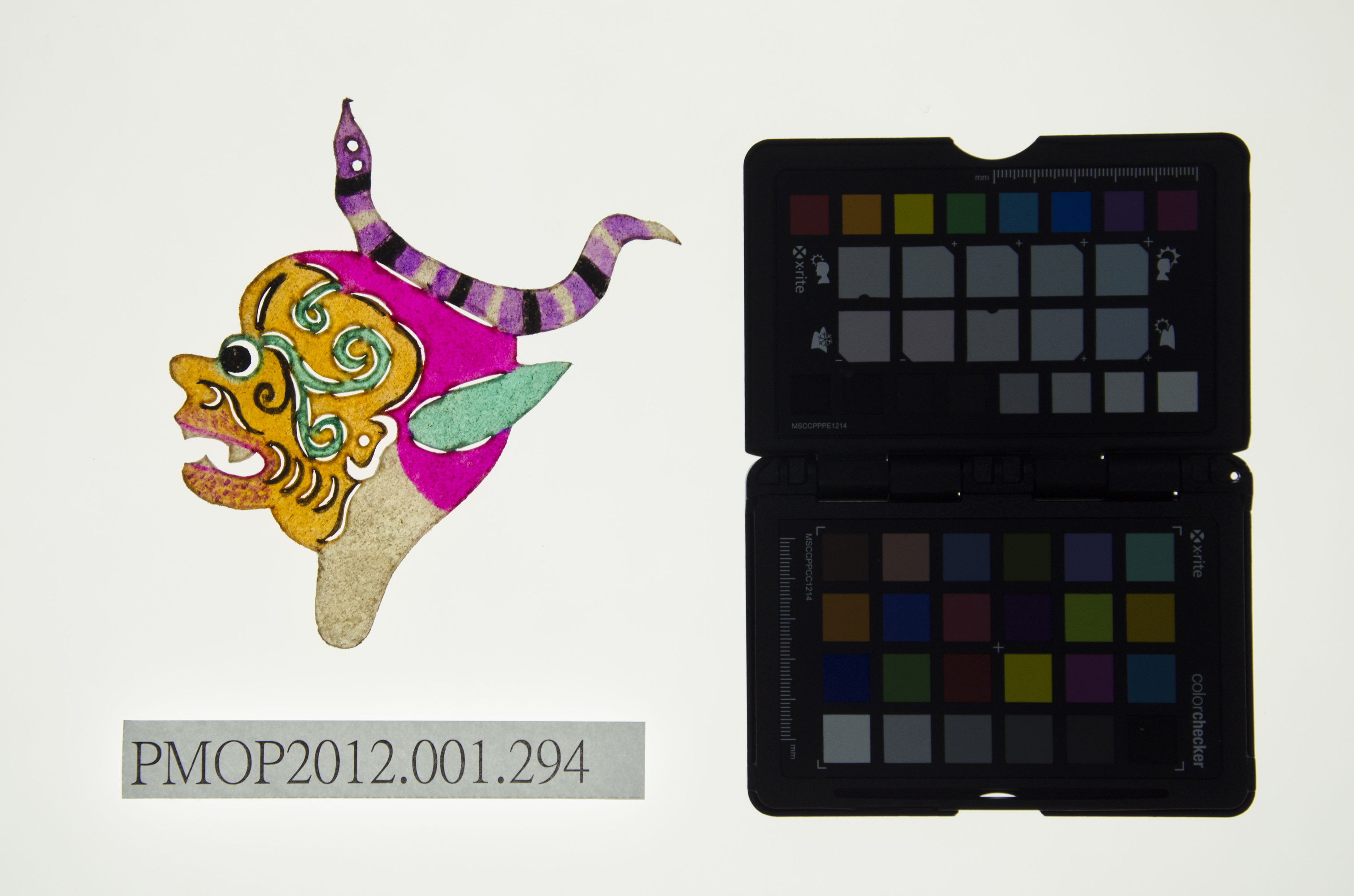 角色說明: 花臉,蛇妖。(濟公傳中赤蓮道人。) 技法說明: 側面五分相陰刻,頭上盤有一條蛇,以食人維生。 詮釋者-東華皮影劇團 張榑國 藝師