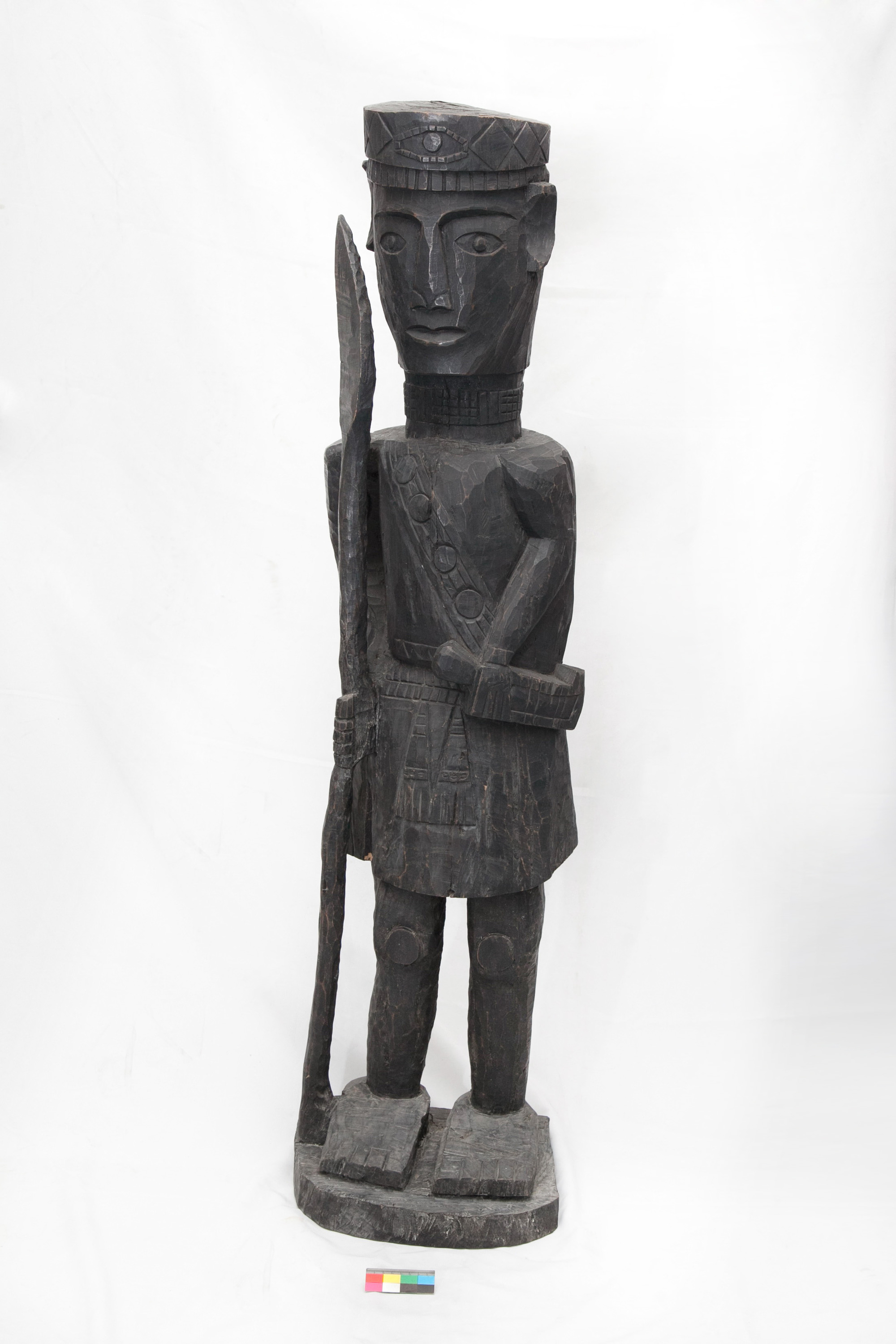 登錄理由:本件木偶雕刻為一勇士立像作品,採手工雕刻,施以黑色塗裝。頭戴蛇紋圓帽,臉部表情樸實,雙眼有神直視,右手手持長矛、左手手按傳統佩刀,身體斜背排灣族傳統服飾紋飾,足部比例特大,表現出作品的勇猛與堅毅。