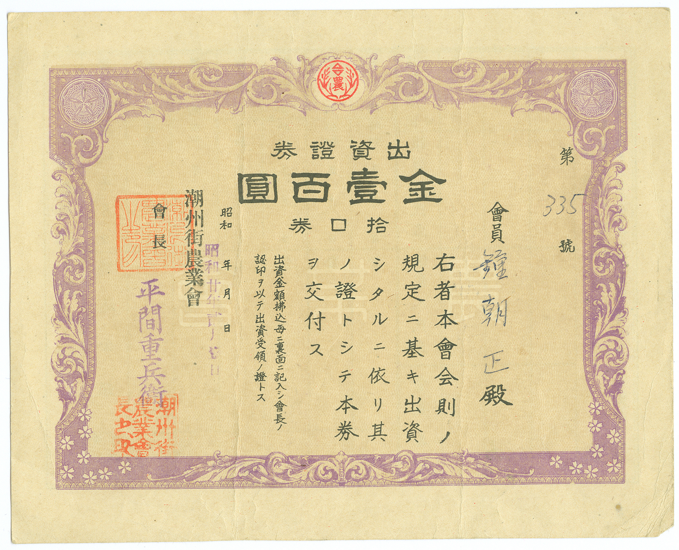 會員鍾朝正殿金壹百元,以此券證明交付。