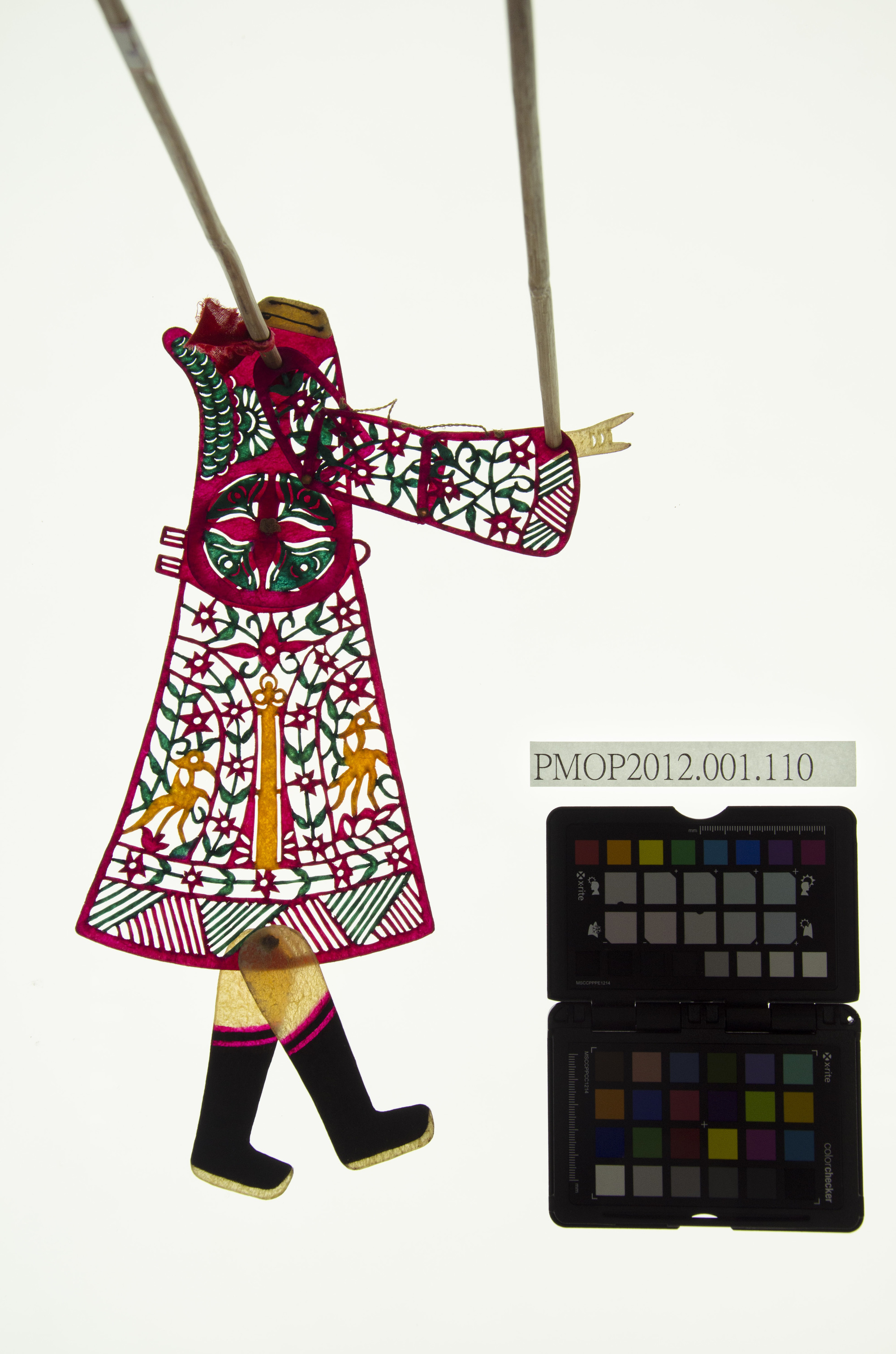 角色說明: 文身。適合狀元郎穿著。扮仙儀式中使用。 技法說明: 陽刻,傳統造型刻有連枝花紋與金色朱雀,僅單手可動,無法轉身。