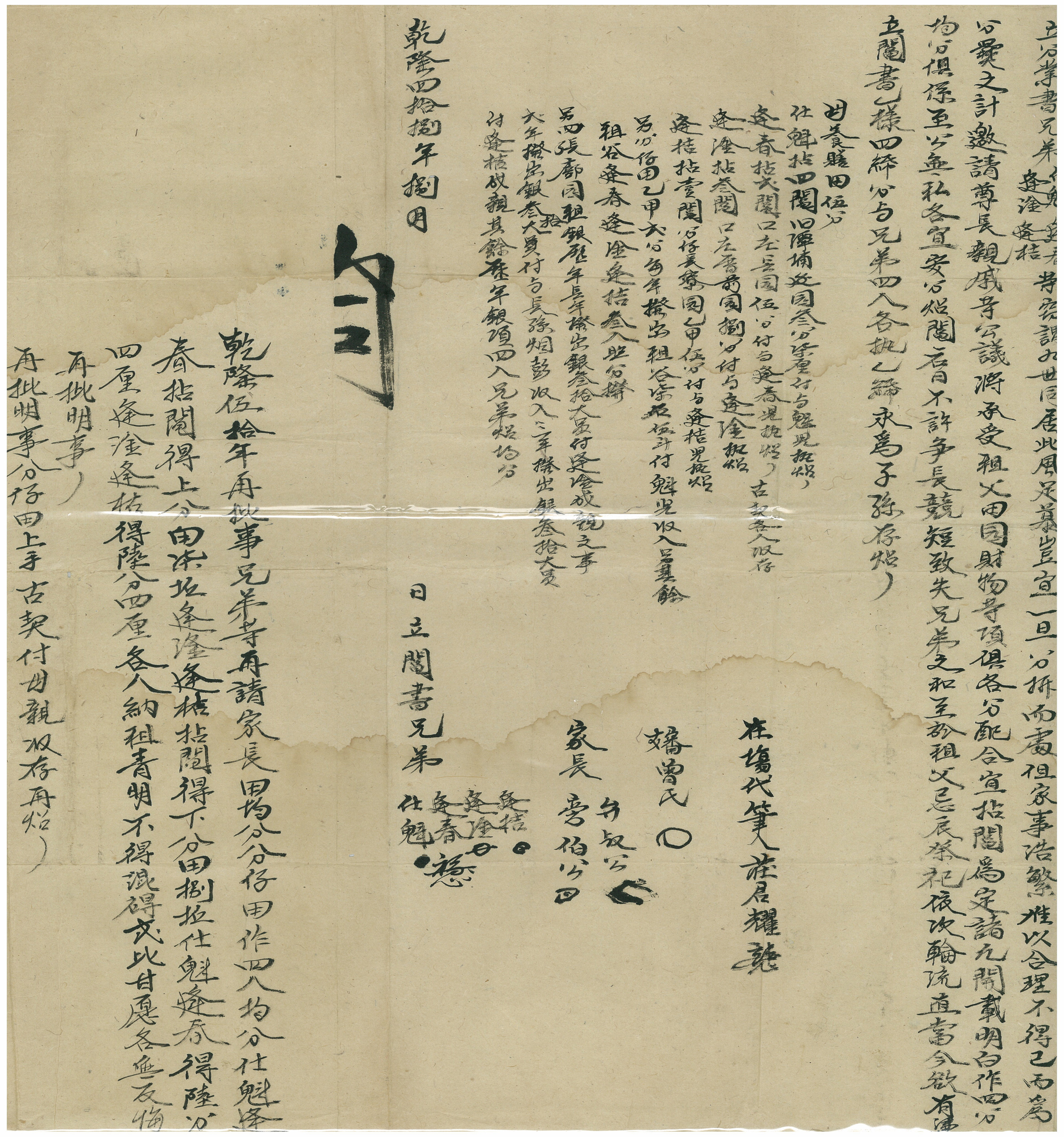 兄弟逢桔、逢淦、逢春、仕魁四人邀請尊長親戚等公議將承受祖父田園財物分配合宜,另長孫仕魁之子每年多分得祖谷7石5升;另於乾隆50年加批各分配分仔田(菸葉田)等。