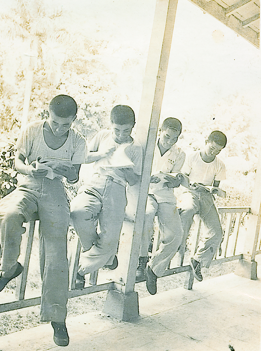 這是照片提供者鍾明珠的父親就讀屏東職業學校時,和同學坐在教室前廊讀書的景象。當時前廊是用木頭圍起來的,大家都把它當成椅子坐,美觀又實用。