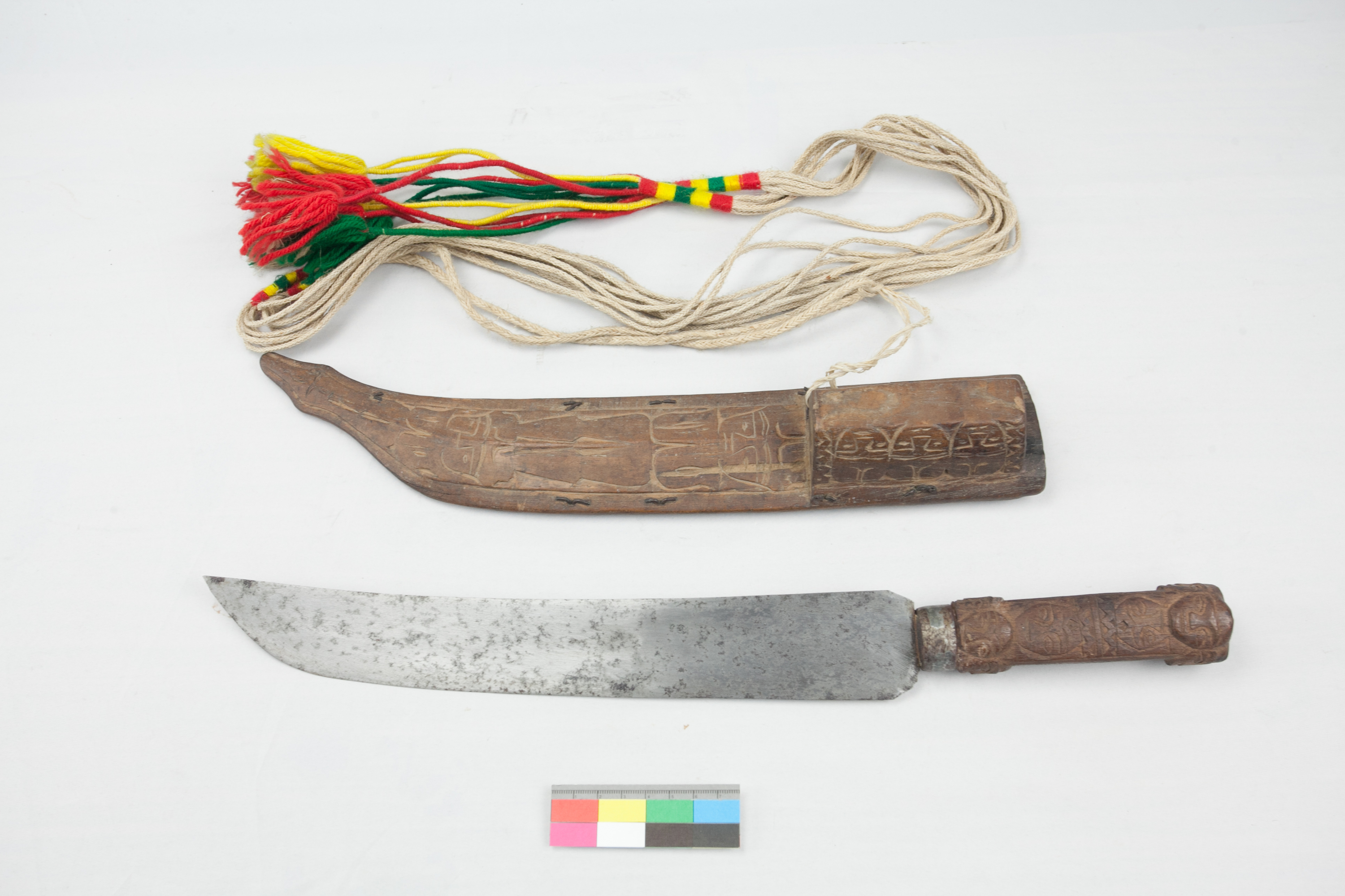 登錄理由:本件獵刀刀柄以傳統藤皮纏繞,刀鞘末端彎轉如百步蛇形,以陽刻技法雕刻百步蛇紋和人像紋,百步蛇紋位於刀鞘上方,下方則雕刻簡單的直立人像紋,人像頭部寫實清晰,身體造型則較忽略。近柄處有護手突起,雕刻人頭紋和百步蛇紋。刀鞘背面使用銅條裝飾,除美學考量外,也可防止刀身滑落。