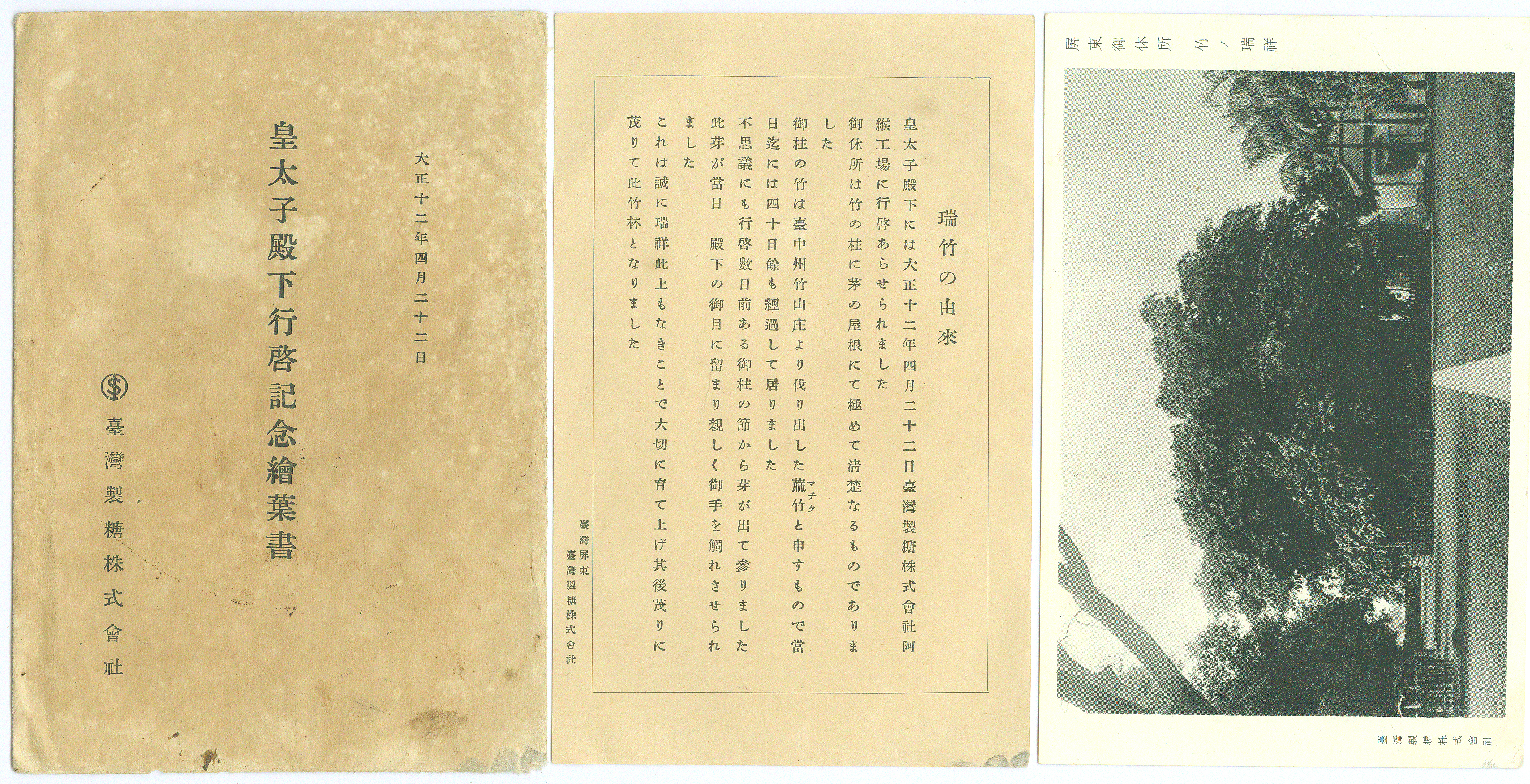 皇太子殿下行啟紀念繪葉書內,包含了屏東御休所的紀念明信片及瑞竹的由來說明。