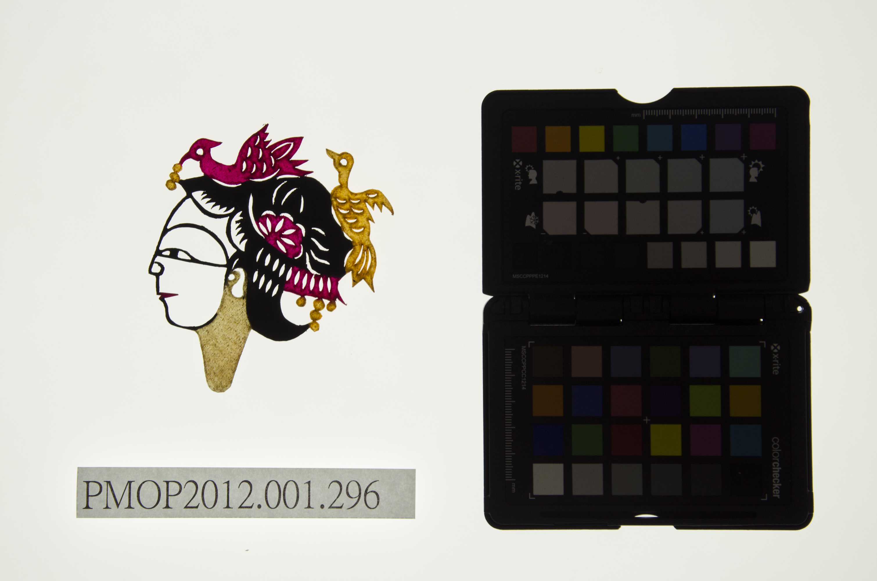 角色說明: 女旦 技法說明: 側面五分相陽刻,頭戴鳳冠。 詮釋者-東華皮影劇團 張榑國 藝師